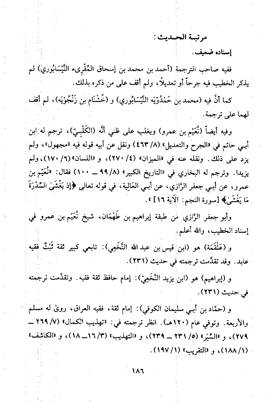 وفيه أيضًا (نُعَيْم بن عمرو) ويغلب على ظني أنَّه (الكَلْبِيّ)، ترجم له ابن أبي حاتم في "الجرح والتعديل" (٨/ ٤٦٣) ونقل عن أبيه قوله فيه "مجهول"، ولم يزد على ذلك. ونقله عنه في "الميزان" (٤/ ٢٧٠)، و"اللسان" (٦/ ١٧٠)، ولم يزيدا. وترجم له البخاري في "التاريخ الكبير" (٨/ ٩٩ - ١٠٠) فقال: "نُعَيْم بن عمرو، عن أبي جعفر الرَّازي، عن أبي العَالِية، في قوله تعالى {إِذْ يَغْشَى السِّدْرَةَ مَا يَغْشَى} [سورة النجم: الآية ١٦] ".