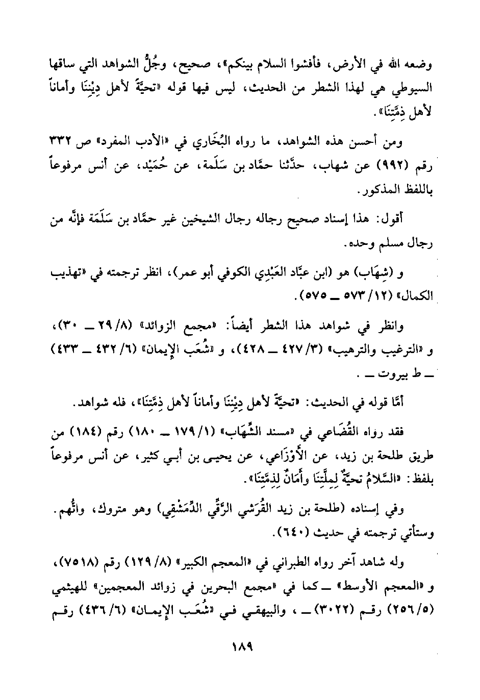 وضعه اللَّه في الأرض، فأفشوا السلام بينكم"، صحيح، وجُلُّ الشواهد التي ساقها السيوطي هي لهذا الشطر من الحديث، ليس فيها قوله "تحيَّةً لأهل دِيْنِنَا وأمانًا الأهل ذِمَّتِنَا".