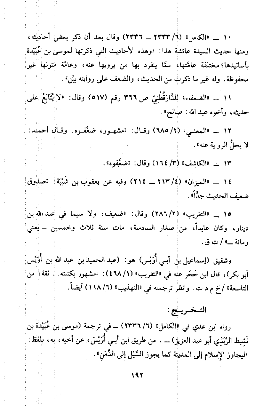 ١٠ - "الكامل" (٦/ ٢٣٣٣ - ٢٣٣٦) وقال بعد أن ذكر بعض أحاديثه، ومنها حديث السيدة عائشة هذا: "وهذه الأحاديث التي ذكرتها لموسى بن عُبَيْدة بأسانيدها؛ مختلفة عامَّتها، ممَّا ينفرد بها من يرويها عنه، وعامَّة متونها غير محفوظة، وله غير ما ذكرت من الحديث، والضعف على روايته بيِّن".