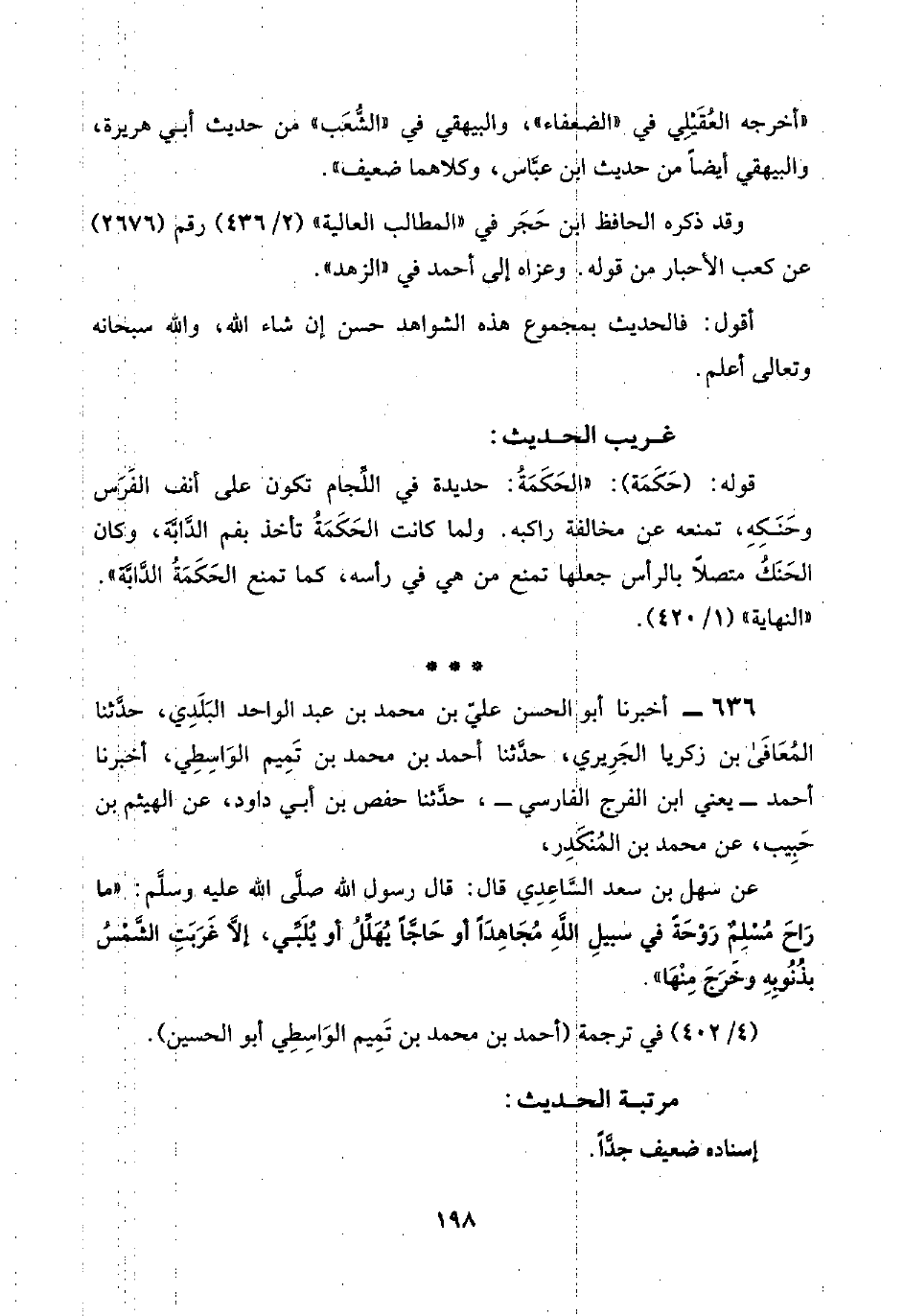٦٣٦ - أخبرنا أبو الحسن عليّ بن محمد بن عبد الواحد البَلَدِي، حدَّثنا الُمعَافَى بن زكريا الجَرِيري، حدَّثنا أحمد بن محمد بن تَمِيم الوَاسِطِي، أخبرنا أحمد -يعني ابن الفرج الفارسي-، حدَّثنا حفص بن أبي داود، عن الهيثم بن حَبِيب، عن محمد بن المُنْكَدِر،