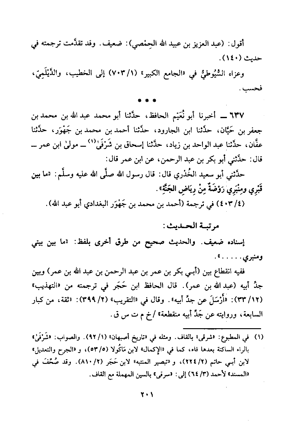 ٦٣٧ - أخبرنا أبو نُعَيْم الحافظ، حدَّثنا أبو محمد عبد اللَّه بن محمد بن جعفر بن حَيَّان، حدَّثنا ابن الجارود، حدَّثنا أحمد بن محمد بن جَهْوَر، حدَّثنا عفَّان، حدَّثنا عبد الواحد بن زياد، حدَّثنا إسحاق بن شَرْفَى (¬١) -مولى ابن عمر- قال: حدَّثني أبو بكر بن عبد الرحمن، عن ابن عمر قال:
