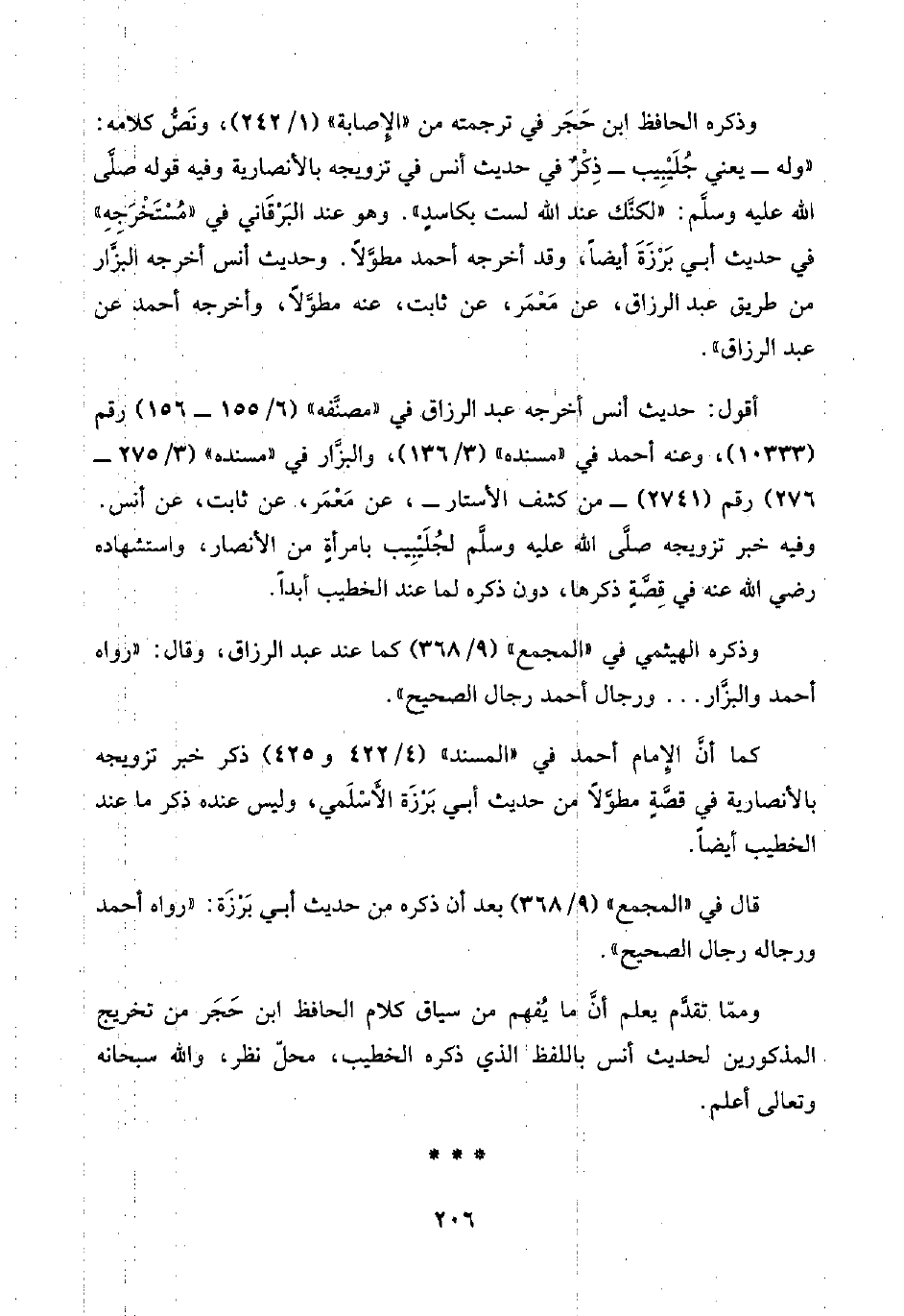 وذكره الحافظ ابن حَجَر في ترجمته من "الإِصابة" (١/ ٢٤٢)، ونَصُّ كلامه: "وله -يعني جُلَيْبِيب- ذِكْرٌ في حديث أنس في تزويجه بالأنصارية وفيه قوله صلَّى اللَّه عليه وسلَّم: "لكنَّك عند اللَّه لست بكاسدٍ". وهو عند البَرْقَاني في "مُسْتَخْرَجِهِ" في حديث أبي بَرْزَةَ أيضًا، وقد أخرجه أحمد مطوَّلًا. وحديث أنس أخرجه البزَّار من طريق عبد الرزاق، عن مَعْمَر، عن ثابت، عنه مطوَّلًا، وأخرجه أحمد عن عبد الرزاق".