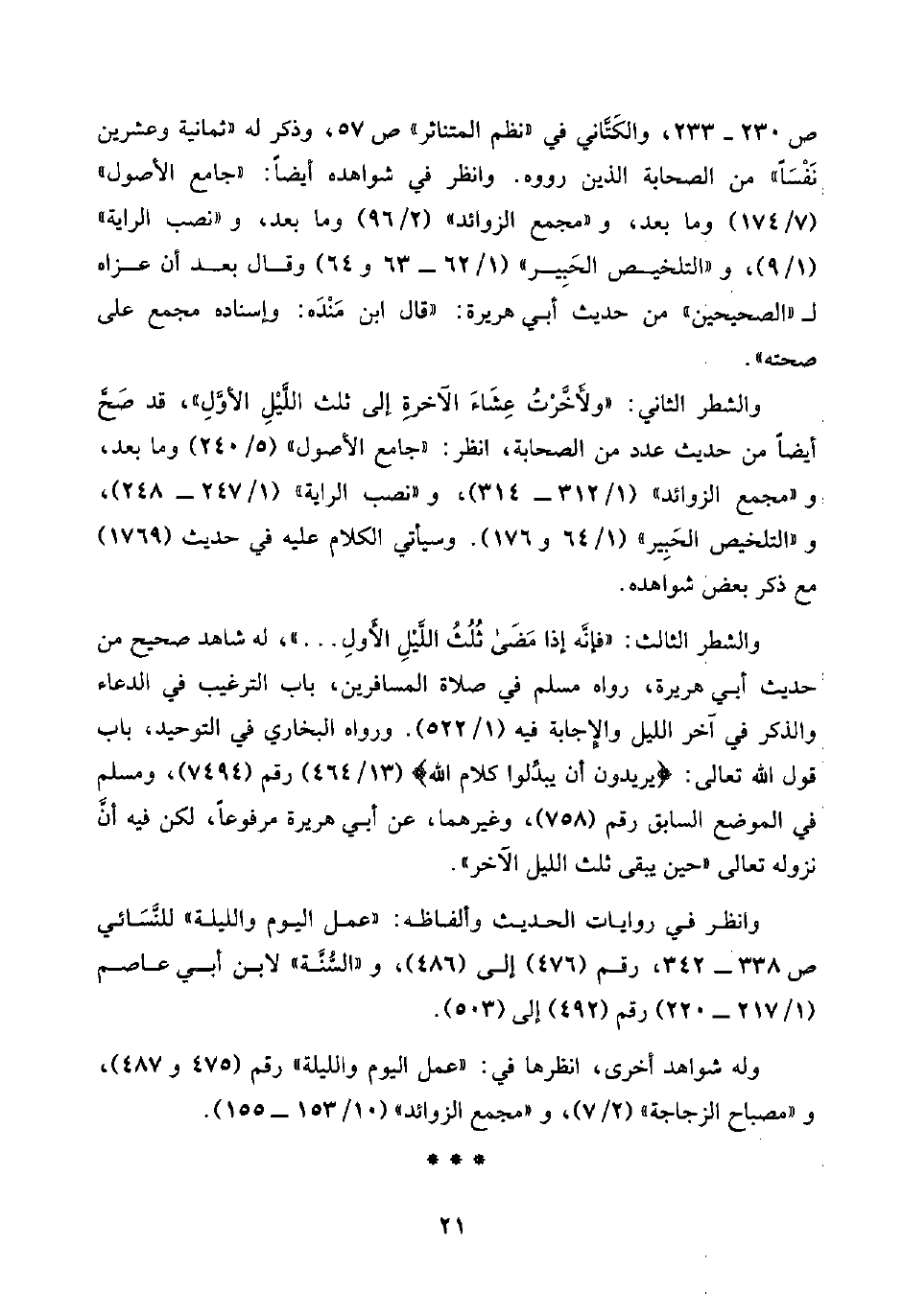 والشطر الثالث: "فإنَّه إذا مَضَى ثُلُثْ اللَّيْلِ الأَولِ. . . "، له شاهد صحيح من حديث أبي هريرة، رواه مسلم في صلاة المسافرين، باب الترغيب في الدعاء والذكر في آخر الليل والإِجابة فيه (١/ ٥٢٢). ورواه البخاري في التوحيد، باب قول اللَّه تعالى: {يُرِيدُونَ أَنْ يُبَدِّلُوا كَلَامَ اللَّهِ} (١٣/ ٤٦٤) رقم (٧٤٩٤)، ومسلم في الموضع السابق رقم (٧٥٨)، وغيرهما، عن أبي هريرة مرفوعًا، لكن فيه أنَّ نزوله تعالى "حين يبقى ثلث الليل الآخر".