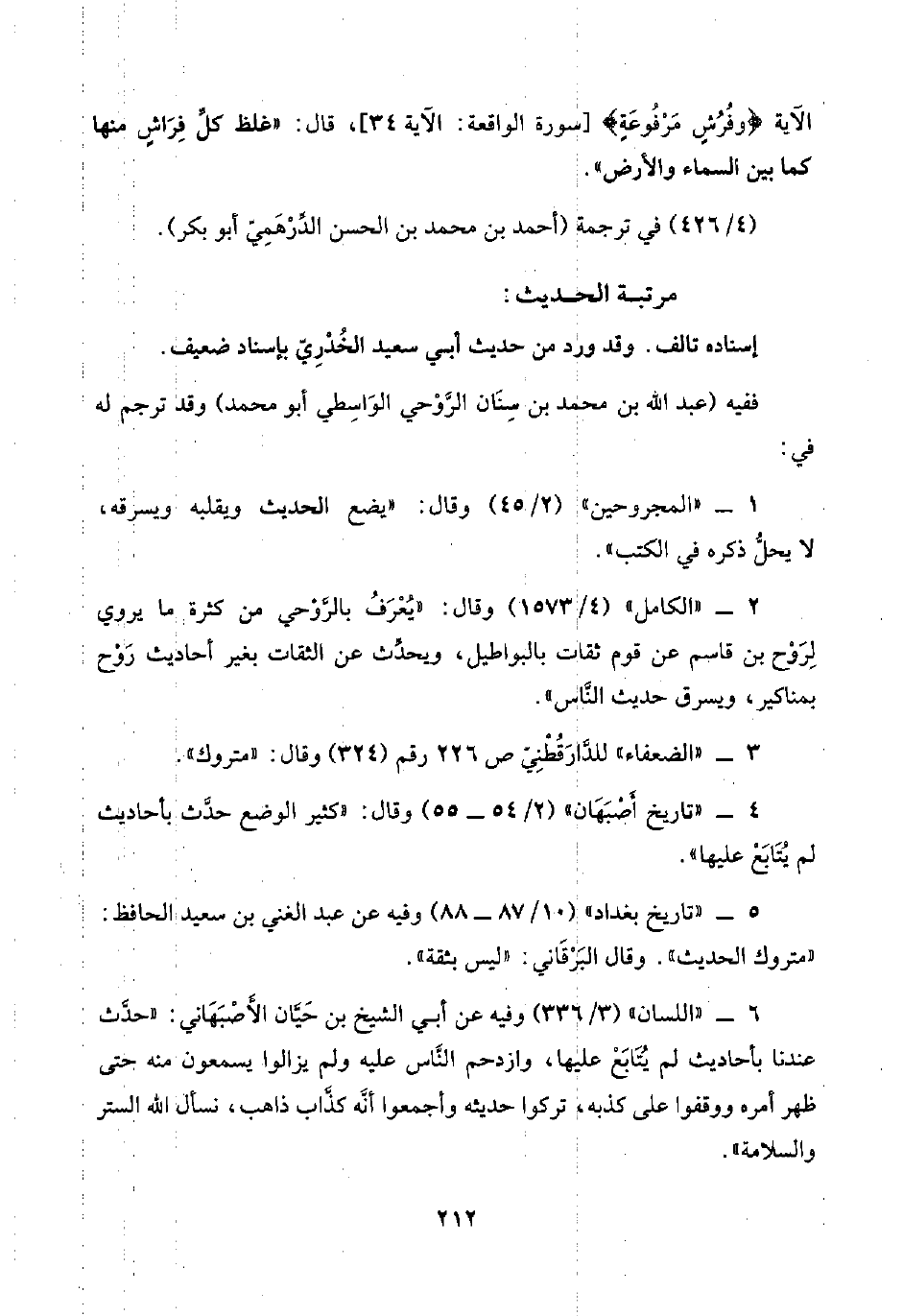 ٢ - "الكامل" (٤/ ١٥٧٣) وقال: "يُعْرَفُ بالرَّوْحي من كثرة ما يروي لِرَوْح بن قاسم عن قوم ثقات بالبواطيل، ويحدِّث عن الثقات بغير أحاديث رَوْح بمناكير، ويسرق حديث النَّاس".