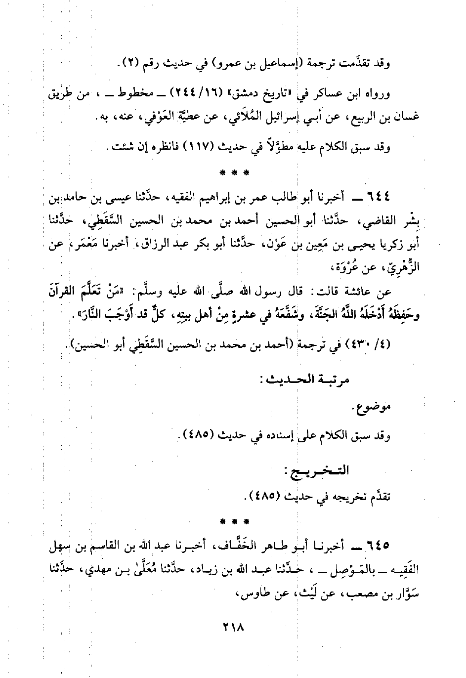 ٦٤٥ - أخبرنا أبو طاهر الخَفَّاف، أخبرنا عبد اللَّه بن القاسم بن سهل الفَقِيه -بالمَوْصِل-، حدَّثنا عبد اللَّه بن زياد، حدَّثنا مُعَلَّى بن مهدي، حدَّثنا سَوَّار بن مصعب، عن لَيْث، عن طاوس،