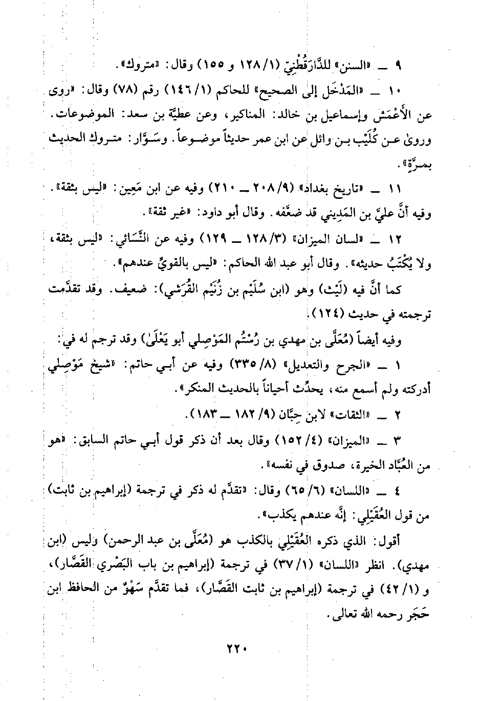 ١٢ - "لسان الميزان" (٣/ ١٢٨ - ١٢٩) وفيه عن النَّسَائي: "ليس بثقة, ولا يُكْتَبُ حديثه". وقال أبو عبد اللَّه الحاكم: "ليس بالقويِّ عندهم".