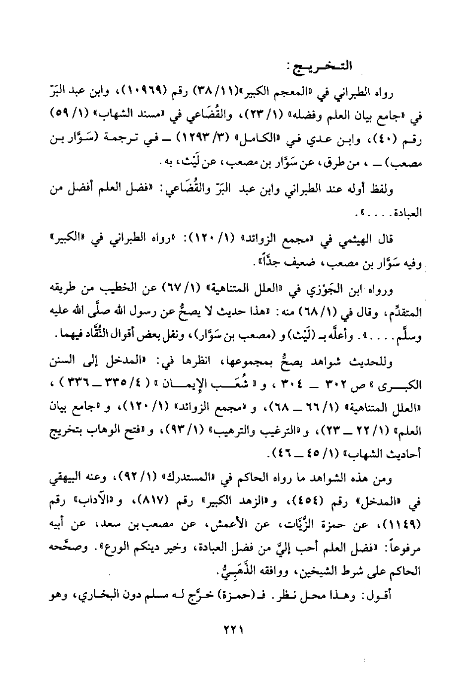 رواه الطبراني في "المعجم الكبير" (١١/ ٣٨) رقم (١٠٩٦٩)، وابن عبد البَرّ في "جامع بيان العلم وفضله" (١/ ٢٣)، والقُضَاعي في "مسند الشهاب" (١/ ٥٩) رقم (٤٠)، وابن عدي في "الكامل" (٣/ ١٢٩٣) -في ترجمة (سَوَّار بن مصعب) -، من طرق، عن سَوَّار بن مصعب، عن لَيْث، به.