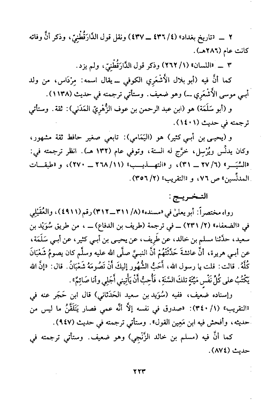 رواه مختصرًا: أبو يعلى في "مسنده" (٨/ ٣١١ - ٣١٢) رقم (٤٩١١)، والعُقَيْلِي في "الضعفاء" (٢/ ٢٣١) -في ترجمة (طريف بن الدفاع) -، من طريق سُوَيْد بن سعيد، حدَّثنا مسلم بن خالد، عن طَرِيف، عن يحيى بن أبي كثير، عن أبي سَلَمَة، عن أبي هريرة، أنَّ عائشةَ حَدَّثَتْهُمْ أنَّ النبيَّ صلَّى اللَّه عليه وسلَّم كان يصومُ شَعْبَانَ كُلَّهُ. قالت: قلت يا رسول اللَّه، أَحَبُّ الشُّهُور إليكَ أَنْ تَصُومَهُ شَعْبَانُ. قال: "إنَّ اللَّه يَكْتُبُ على كُلِّ نَفْسٍ مَيِّتَةٍ تلكَ السَّنَةِ، فَأُحِبُّ أَنْ يَأْتِيني أَجَلِي وأنا صَائِمٌ".