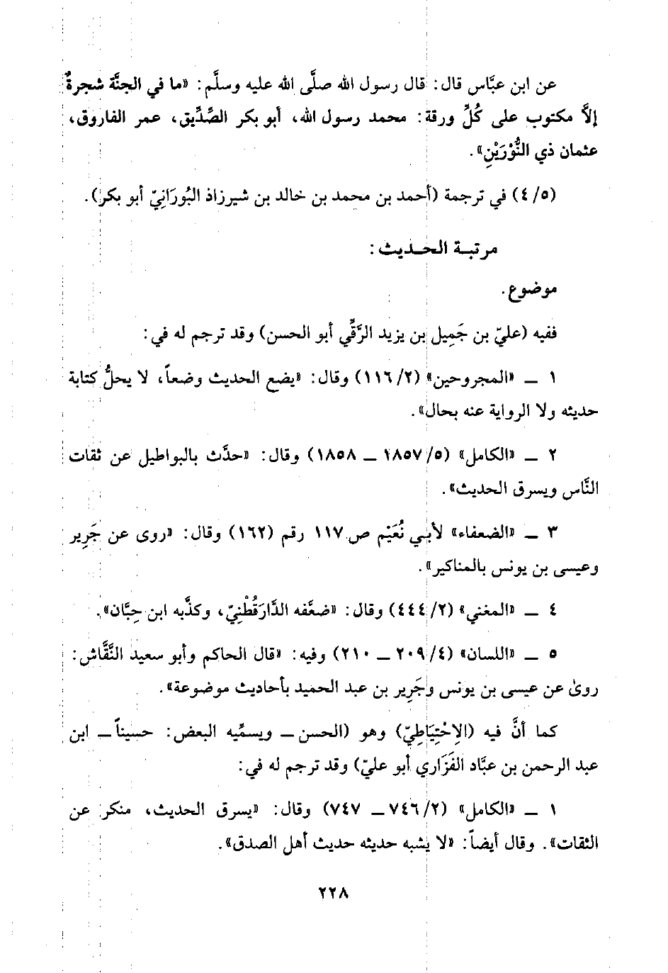 عن ابن عبَّاس قال: قال رسول اللَّه صلَّى اللَّه عليه وسلَّم: "ما في الجنَّة شجرةٌ إلَّا مكتوب على كُلِّ ورقة: محمد رسول اللَّه، أبو بكر الصِّدِّيق، عمر الفاروق، عثمان ذي النُّوْرَيْنِ".