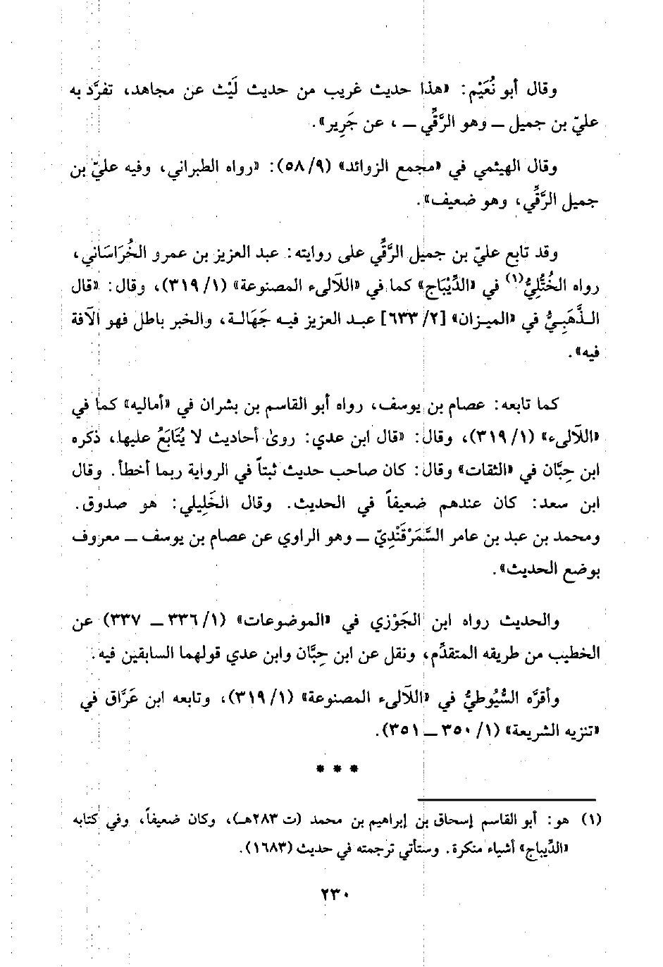 وقال أبو نُعَيْم: هذا حديث غريب من حديث لَيْث عن مجاهد، تفرَّد به عليّ بن جميل -وهو الرَّقِّي-، عن جَرِير".