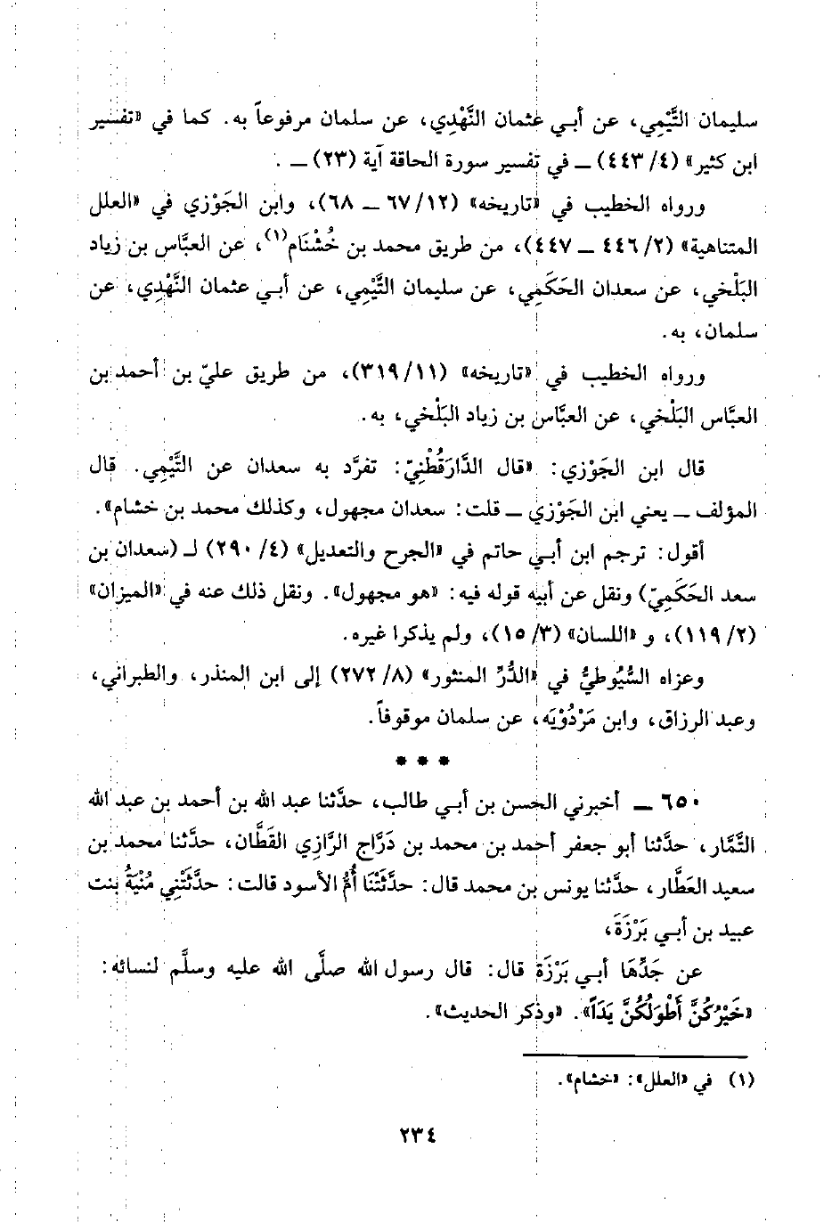 ورواه الخطيب في "تاريخه" (١٢/ ٦٧ - ٦٨)، وابن الجَوْزي في "العلل المتناهية" (٢/ ٤٤٦ - ١٤٧)، من طريق محمد بن خُشْنَام (¬١)، عن العبَّاس بن زياد البَلْخي، عن سعدان الحَكَمِي، عن سليمان التَّيْمِي، عن أبي عثمان النَّهْدِي، عن سلمان، به.