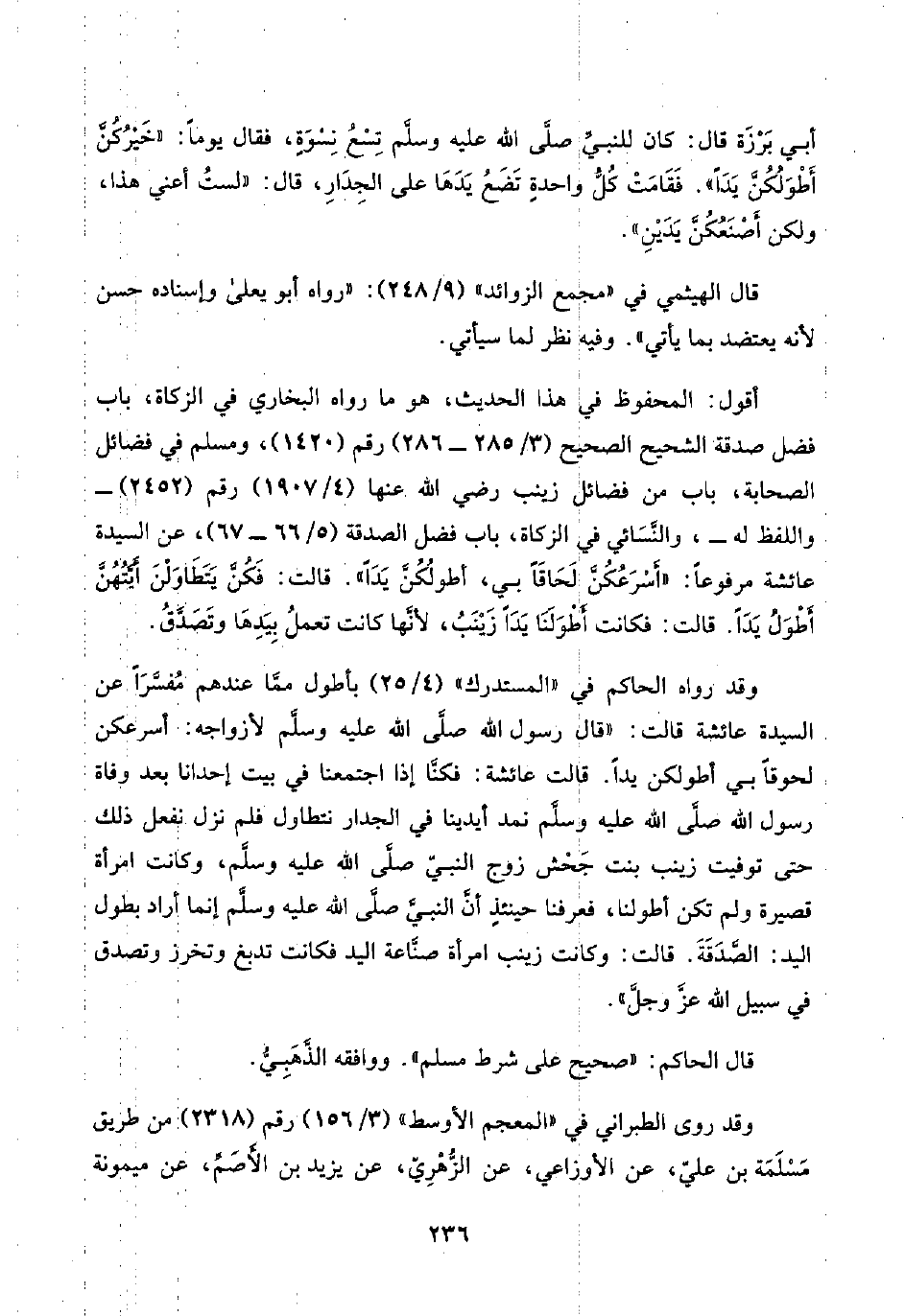وقد رواه الحاكم في "المستدرك" (٤/ ٢٥) بأطول ممَّا عندهم مُفسَّرًا عن السيدة عائشة قالت: "قال رسول اللَّه صلَّى اللَّه عليه وسلَّم لأزواجه: أسرعكن لحوقًا بي أطولكن يدًا. قالت عائشة: فكنَّا إذا اجتمعنا في بيت إحدانا بعد وفاة رسول اللَّه صلَّى اللَّه عليه وسلَّم نمد أيدينا في الجدار نتطاول فلم نزل نفعل ذلك حتى توفيت زينب بنت جَحْش زوج النبيّ صلَّى اللَّه عليه وسلَّم، وكانت امرأة قصيرة ولم تكن أطولنا، فعرفنا حينئذٍ أنَّ النبيَّ صلَّى اللَّه عليه وسلَّم إنما أراد بطول اليد: الصَّدَقَةَ. قالت: وكانت زينب امرأة صنَّاعة اليد فكانت تدبغ وتخرز وتصدق في سبيل اللَّه عزَّ وجلَّ".