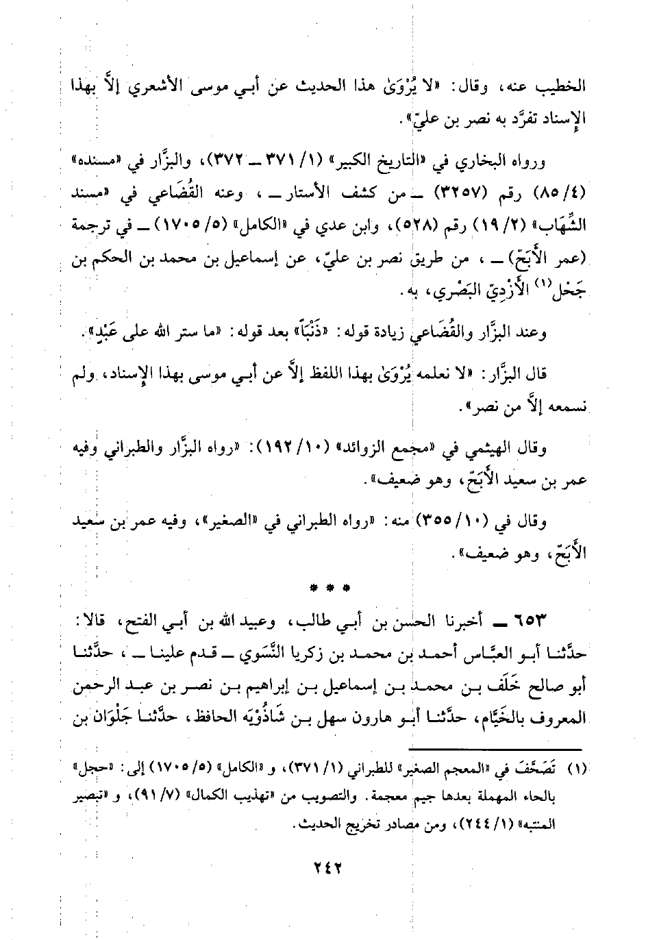 ورواه البخاري في "التاريخ الكبير" (١/ ٣٧١ - ٣٧٢)، والبزَّار في "مسنده" (٤/ ٨٥) رقم (٣٢٥٧) -من كشف الأستار-، وعنه القُضَاعي في "مسند الشِّهَاب" (٢/ ١٩) رقم (٥٢٨)، وابن عدي في "الكامل" (٥/ ١٧٠٥) -في ترجمة (عمر الأَبَحّ) -، من طريق نصر بن عليّ، عن إسماعيل بن محمد بن الحكم بن جَحْل (¬١) الأَزْدِيّ البَصْري، به.