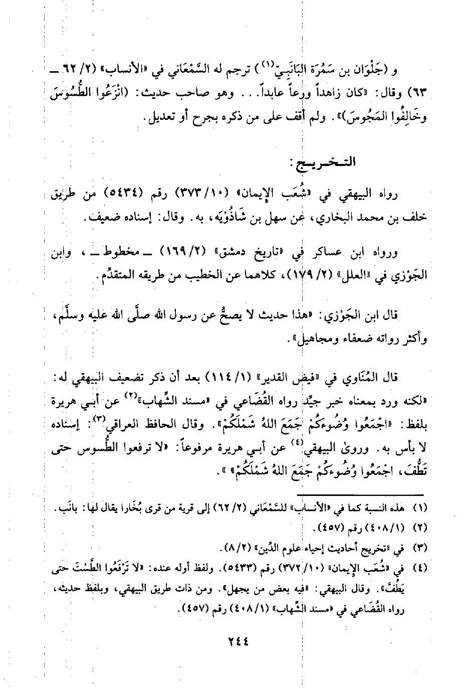 قال المُنَاوي في "فيض القدير" (١/ ١١٤) بعد أن ذكر تضعيف البيهقي له: "لكنه ورد بمعناه خبر جيِّد رواه القُضَاعي في "مسند الشِّهاب" (¬٢) عن أبي هريرة بلفظ: "اجْمَعُوا وُضُوءَكُمْ جَمَعَ اللَّهُ شَمْلَكُمْ". وقال الحافظ العراقي (¬٣): إسناده لا بأس به. وروى البيهقي (¬٤) عن أبي هريرة مرفوعًا: "لا ترفعوا الطُّسوس حتى تَطُّفَ، اجْمَعُوا وُضُوءَكُمْ جَمَعَ اللَّهُ شَمْلَكُمْ"".