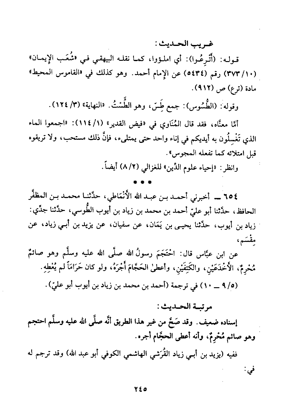 إسناده ضعيف. وقد صَحَّ من غير هذا الطريق أنَّه صلَّى اللَّه عليه وسلَّم احتجم وهو صائم مُحْرِمٌ، وأنه أعطى الحجَّام أجره.