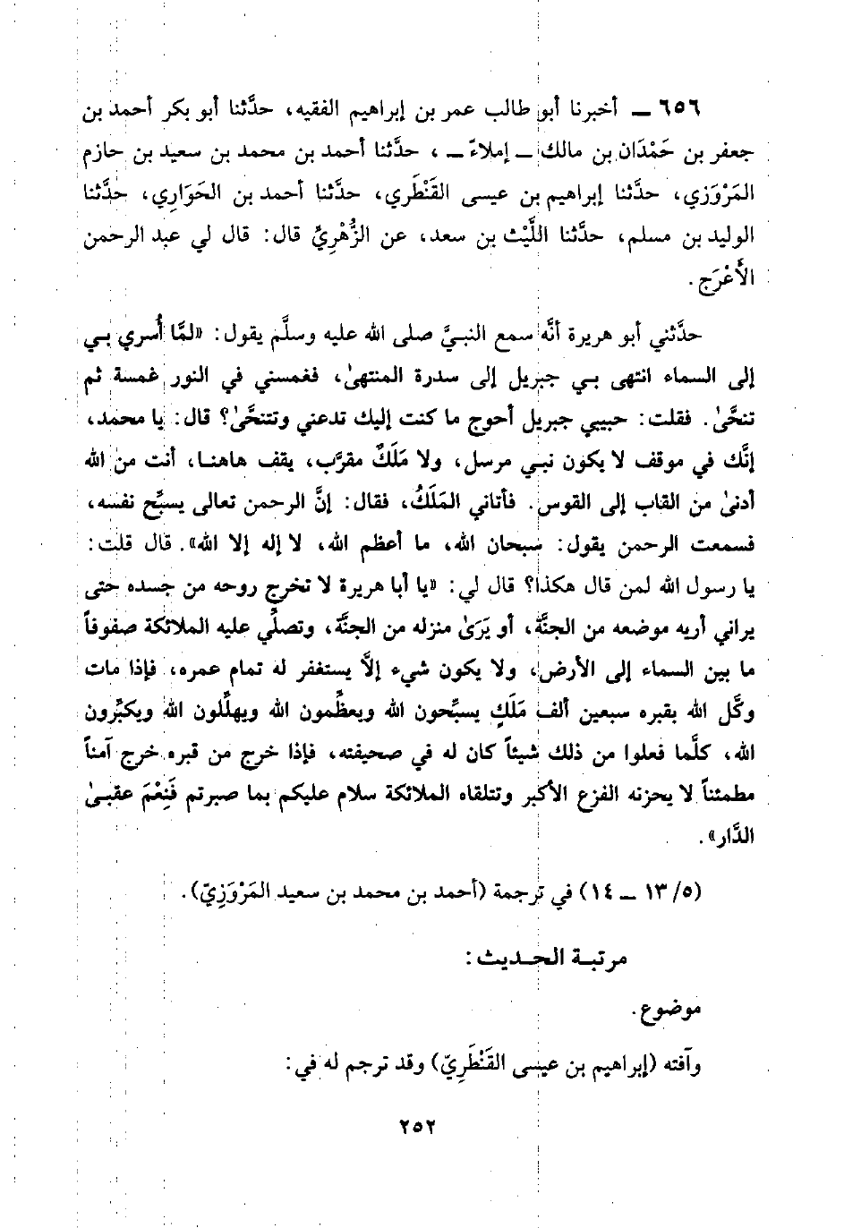 حدَّثني أبو هريرة أنَّه سمع النبيَّ صلى اللَّه عليه وسلَّم يقول: "لمَّا أُسري بي إلى السماء انتهى بي جبريل إلى سدرة المنتهى، فغمسني في النور غمسة ثم تنحَّى. فقلت: حبيبي جبريل أحوج ما كنت إليك تدعني وتتنحَّى؟ قال: يا محمد، إنَّك في موقف لا يكون نبي مرسل، ولا مَلَكٌ مقرَّب، يقف هاهنا، أنت من اللَّه أدنى من القباب إلى القوس. فأتاني المَلَكُ، فقال: إنَّ الرحمن تعالى يسبِّح نفسه، فسمعت الرحمن يقول: سبحان اللَّه، ما أعظم اللَّه، لا إله إلا اللَّه". قال قلت: يا رسول اللَّه لمن قال هكذا؟ قال لي: "يا أبا هريرة لا تخرج روحه من جسده حتى يراني أريه موضعه من الجنَّة، أو يَرَى منزله من الجنَّة، وتصلِّي عليه الملائكة صفوفًا ما بين السماء إلى الأرض، ولا يكون شيء إلَّا يستغفر له تمام عمره، فإذا مات وكَّل اللَّه بقبره سبعين ألف مَلَكٍ يسبِّحون اللَّه ويعظِّمون اللَّه ويهلِّلون اللَّه ويكبِّرون، اللَّه، كلَّما فعلوا من ذلك شيئًا كان له في صحيفته، فإذا خرج من قبره خرج آمنًا مطمئنًا لا يحزنه الفزع الأكبر وتتلقاه الملائكة سلام عليكم بما صبرتم فَنِعْمَ عقبى الدَّار".