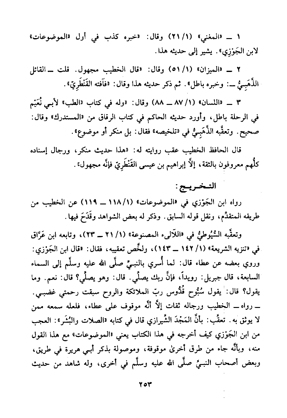 وتعقَّبه السُّيُوطيُّ في "اللآلئ المصنوعة" (١/ ٢١ - ٢٣)، وتابعه ابن عَرَّاق في "تنزيه الشريعة" (١/ ١٤٢ - ١٤٣)، ولخَّص تعقيبه، فقال: "قال ابن الجَوْزي: وروي بعضه عن عطاء قال: لما أُسري بالنبيِّ صلَّى اللَّه عليه وسلَّم إلى السماء السابعة، قال جبريل: رويدًا، فإنَّ ربك يصلِّي. قال: وهو يصلِّي؟ قال: نعم. وما يقول؟ قال: يقول سُبُّوح قُدُّوس ربّ الملائكة والروح سبقت رحمتي غضبي. -رواه- الخطيب ورجاله ثقات إلّا أنَّه موقوف على عطاء، فلعله سمعه ممن لا يوثق به. تعقِّب: بأنَّ المَجْد الشِّيرازي قال في كتابه "الصلات والبُشَر": العجب من ابن الجَوْزي كيف أخرجه في هذا الكتاب يعني "الموضوعات" مع هذا القول منه، وبأنَّه جاء من طرق أخرى موقوفة، وموصولة بذكر أبي هريرة في طريق، وبعض أصحاب النبيِّ صلَّى اللَّه عليه وسلَّم في أخرى، وله شاهد من حديث