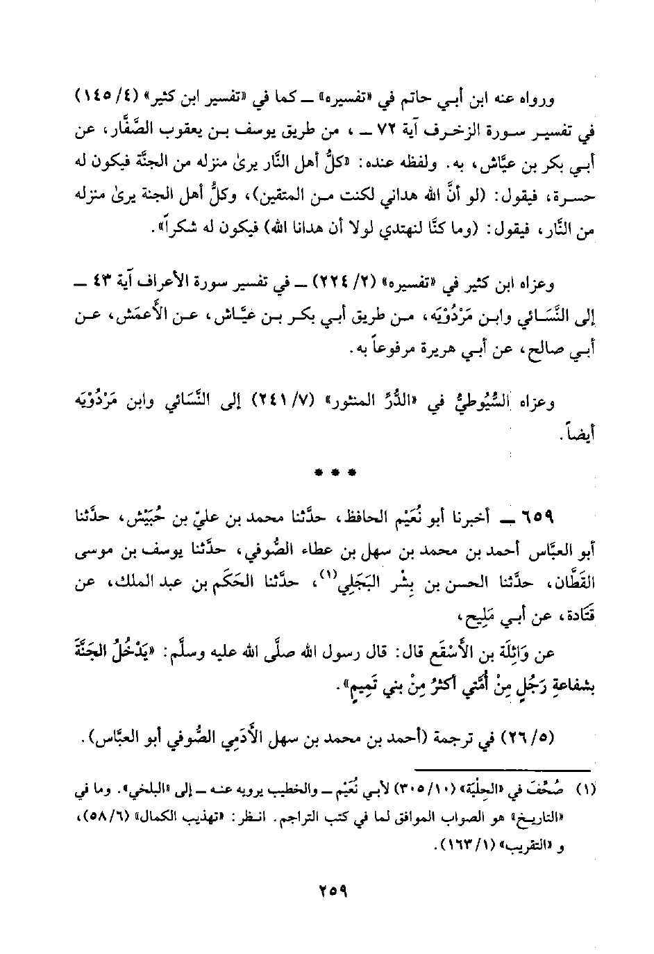 ورواه عنه ابن أبي حاتم في "تفسيره" -كما في "تفسير ابن كثير" (٤/ ١٤٥) في تفسير سورة الزخرف آية ٧٢ - ، من طريق يوسف بن يعقوب الصَّفَّار، عن أبي بكر بن عيَّاش، به. ولفظه عنده: "كلُّ أهل النَّار يرى منزله من الجنَّة فيكون له حسرة، فيقول: (لو أنَّ اللَّه هداني لكنت من المتقين)، وكلُّ أهل الجنة يرى منزله من النَّار، فيقول: (وما كنَّا لنهتدي لولا أن هدانا اللَّه) فيكون له شكرًا".