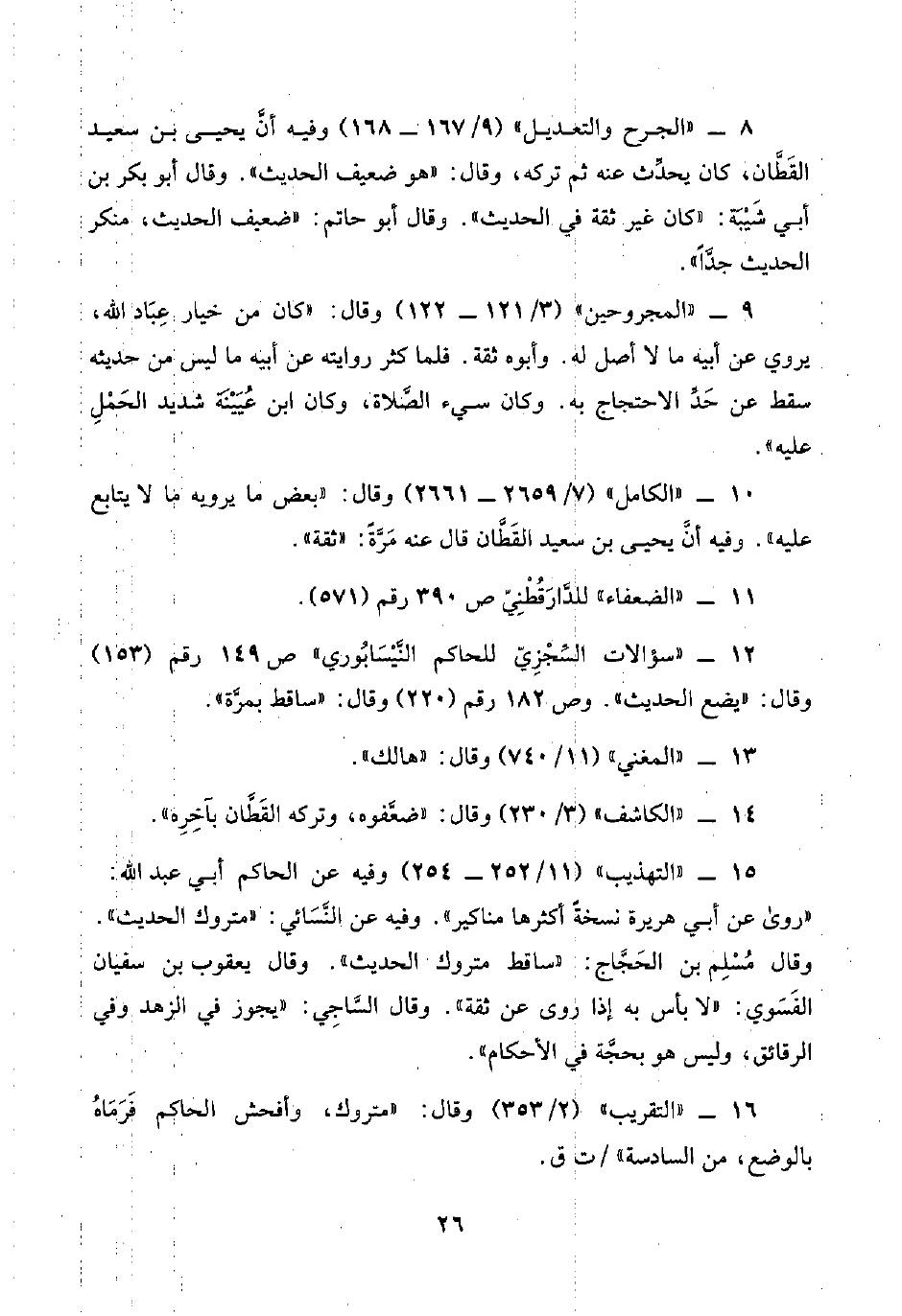 ٨ - "الجرح والتعديل" (٩/ ١٦٧ - ١٦٨) وفيه أنَّ يحيى بن سعيد القَطَّان، كان يحدِّث عنه ثم تركه، وقال: "هو ضعيف الحديث". وقال أبو بكر بن أبي شَيْبَة: "كان غير ثقة في الحديث". وقال أبو حاتم: "ضعيف الحديث، منكر الحديث جدًّا".