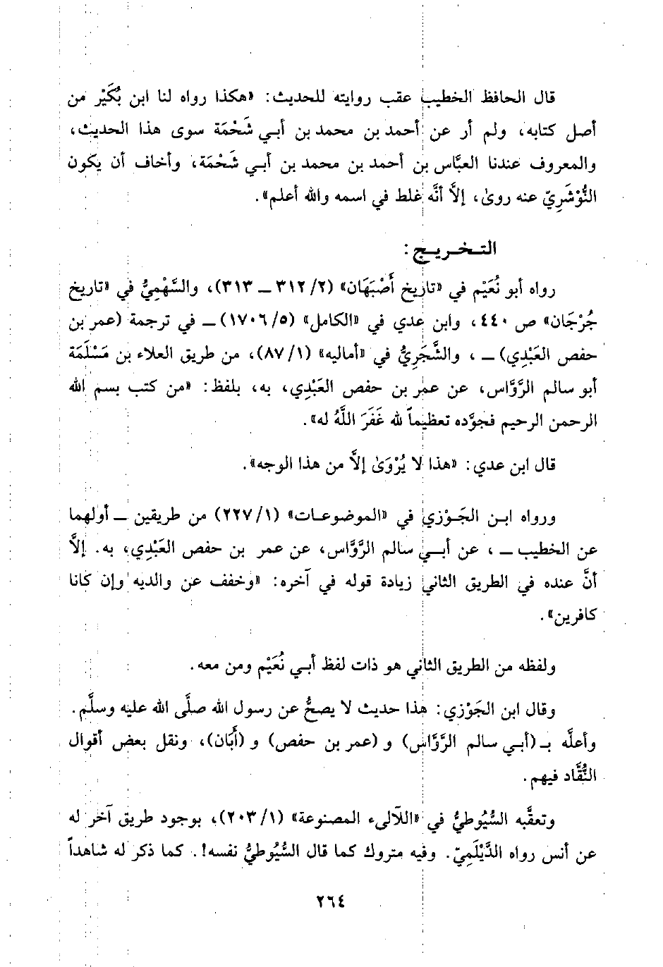 رواه أبو نُعَيْم في "تاريخ أَصْبَهَان" (٢/ ٣١٢ - ٣١٣)، والسَّهْمِيُّ في "تاريخ جُرْجَان" ص ٤٤٠، وابن عدي في "الكامل" (٥/ ١٧٠٦) -في ترجمة (عمر بن حفص العَبْدِي) -، والشَّجَرِيُّ في "أماليه" (١/ ٨٧)، من طريق العلاء بن مَسْلَمَة أبو سالم الرَّوَّاس، عن عمر بن حفص العَبْدِي، به، بلفظ: "من كتب بسم اللَّه الرحمن الرحيم فجوَّده تعظيمًا للَّه غَفَرَ اللَّهُ له".