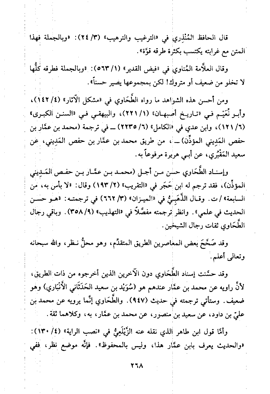 ومن أحسن هذه الشواهد ما رواه الطَّحَاوي في "مشكل الآثار" (٤/ ١٤٢)، وأبو نُعَيْم في "تاريخ أصبهان" (١/ ٢٢١)، والبيهقي في "السنن الكبرى" (٦/ ١٢١)، وابن عدي في "الكامل" (٦/ ٢٢٣٥) -في ترجمة (محمد بن عمَّار بن حفص المَدِيني المؤذِّن) -، من طريق محمد بن عمَّار بن حفص المَدِيني، عن سعيد المَقْبُري، عن أبي هريرة مرفوعًا به.