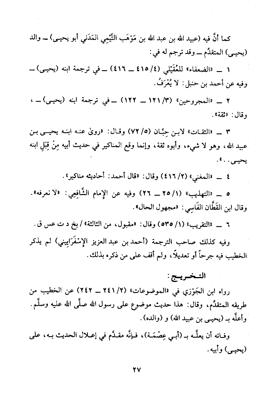 ٥ - "التهذيب" (١/ ٢٥ - ٢٦) وفيه عن الإِمام الشَّافِعِي: "لا نعرفه". وقال ابن القَطَّان الفَاسِي: "مجهول الحال".