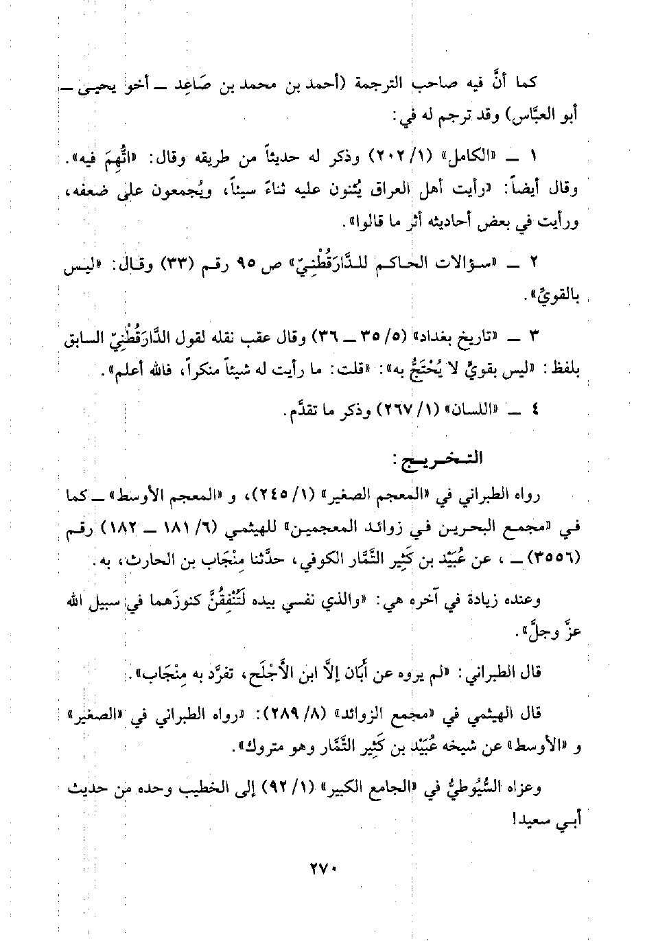 ٣ - "تاريخ بغداد" (٥/ ٣٥ - ٣٦) وقال عقب نقله لقول الدَّارَقُطْنِيّ السابق بلفظ: "ليس بقويٍّ لا يُحْتَجُّ به": "قلت: ما رأيت له شيئًا منكرًا، فاللَّه أعلم".