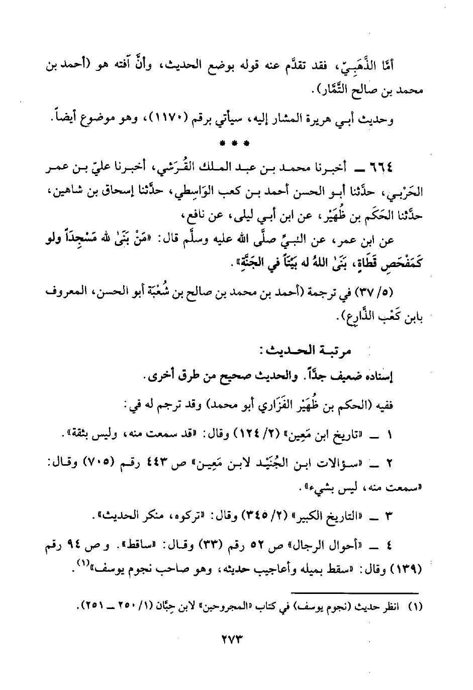 ٦٦٤ - أخبرنا محمد بن عبد الملك القُرَشي، أخبرنا عليّ بن عمر الحَرْبي، حدَّثنا أبو الحسن أحمد بن كعب الوَاسِطي، حدَّثنا إسحاق بن شاهين، حدَّثنا الحَكَم بن ظُهَيْر، عن ابن أبي ليلى، عن نافع،