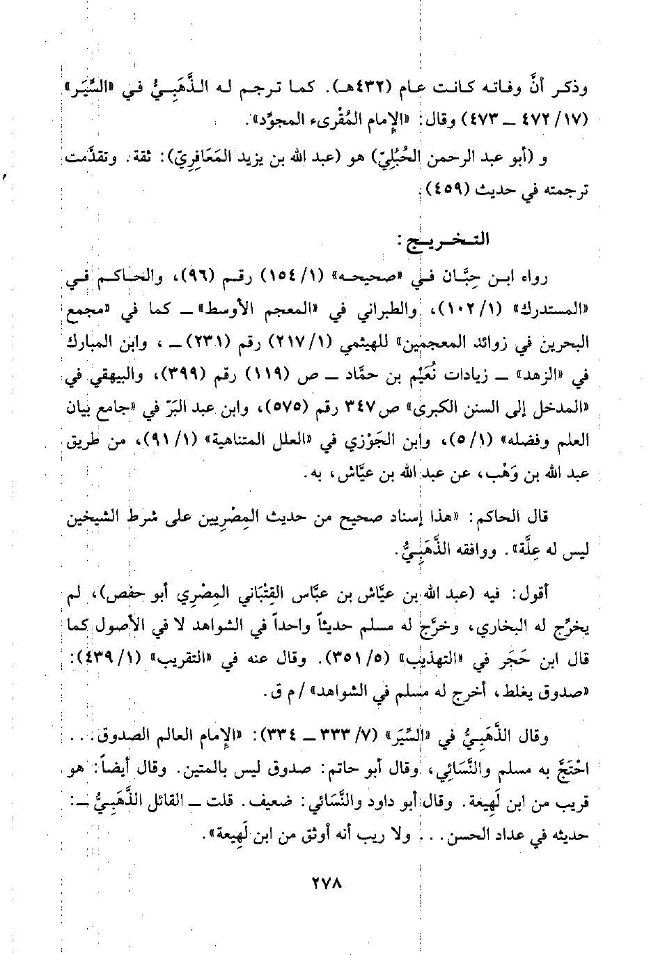قال الحاكم: "هذا إسناد صحيح من حديث المِصْرِيين على شرط الشيخين ليس له عِلَّة". ووافقه الذَّهَبِيُّ.