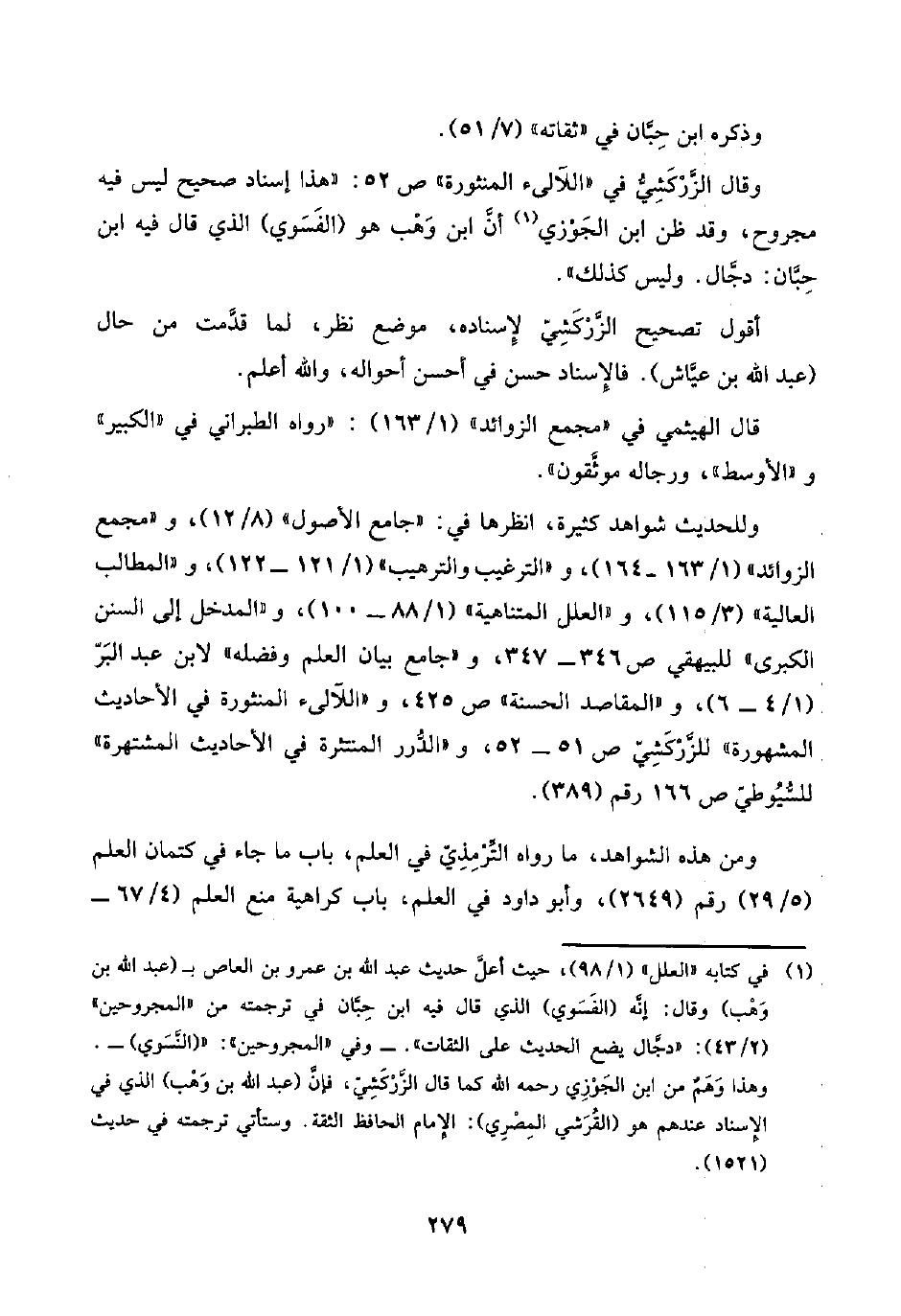وقال الزَّرْكَشِيُّ في "اللآلئ المنثورة" ص ٥٢: "هذا إسناد صحيح ليس فيه مجروح، وقد ظن ابن الجَوْزي (¬١) أنَّ ابن وَهْب هو (الفَسَوي) الذي قال فيه ابن حِبَّان: دجَّال. وليس كذلك".