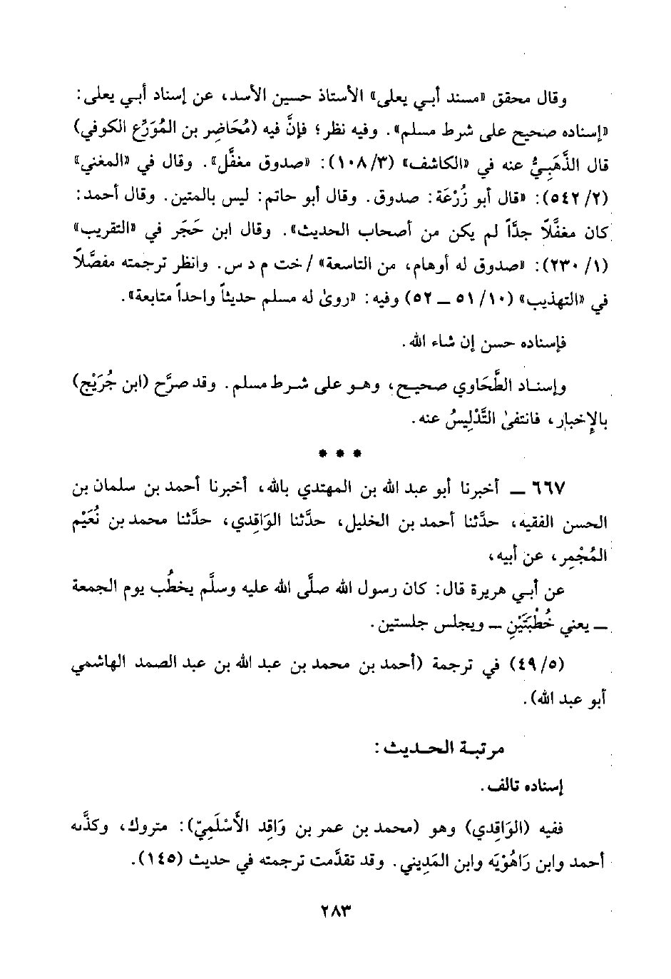 ٦٦٧ - أخبرنا أبو عبد اللَّه بن المهتدي باللَّه، أخبرنا أحمد بن سلمان بن الحسن الفقيه، حدَّثنا أحمد بن الخليل، حدَّثنا الوَاقِدي، حدَّثنا محمد بن نُعَيْم المُجْمِر، عن أبيه،