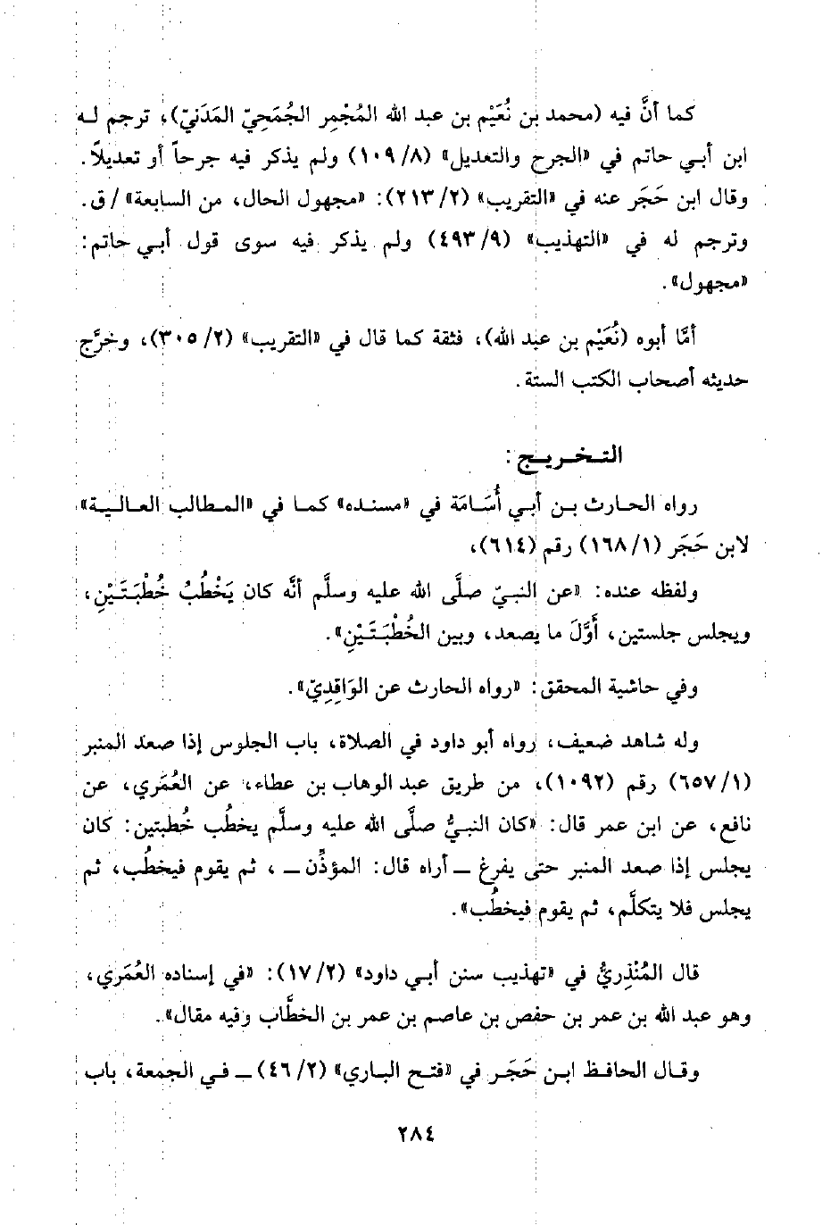كما أنَّ فيه (محمد بن نُعَيْم بن عبد اللَّه المُجْمِر الجُمَحِيّ المَدَنيّ)، ترجم له ابن أبي حاتم في "الجرح والتعديل" (٨/ ١٠٩) ولم يذكر فيه جرحًا أو تعديلًا. وقال ابن حَجَر عنه في "التقريب" (٢/ ٢١٣): "مجهول الحال، من السابعة"/ ق. وترجم له في "التهذيب" (٩/ ٤٩٣) ولم يذكر فيه سوى قول أبي حاتم: "مجهول".