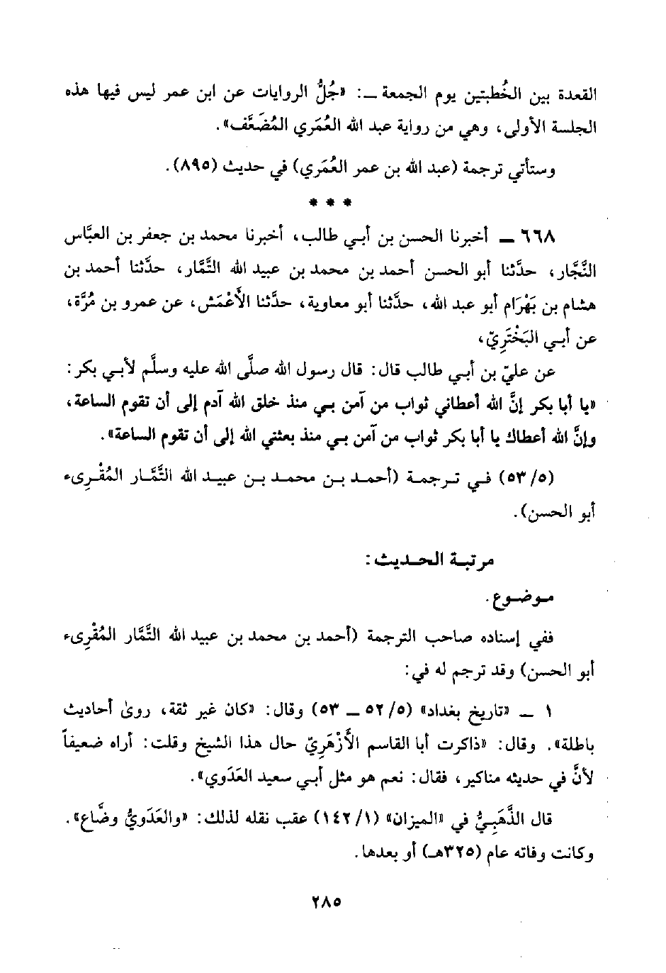 ١ - "تاريخ بغداد" (٥/ ٥٢ - ٥٣) وقال: "كان غير ثقة، روى أحاديث باطلة". وقال: "ذاكرت أبا القاسم الأَزْهَرِيّ حال هذا الشيخ وقلت: أراه ضعيفًا لأنَّ في حديثه مناكير، فقال: نعم هو مثل أبي سعيد العَدَوي".