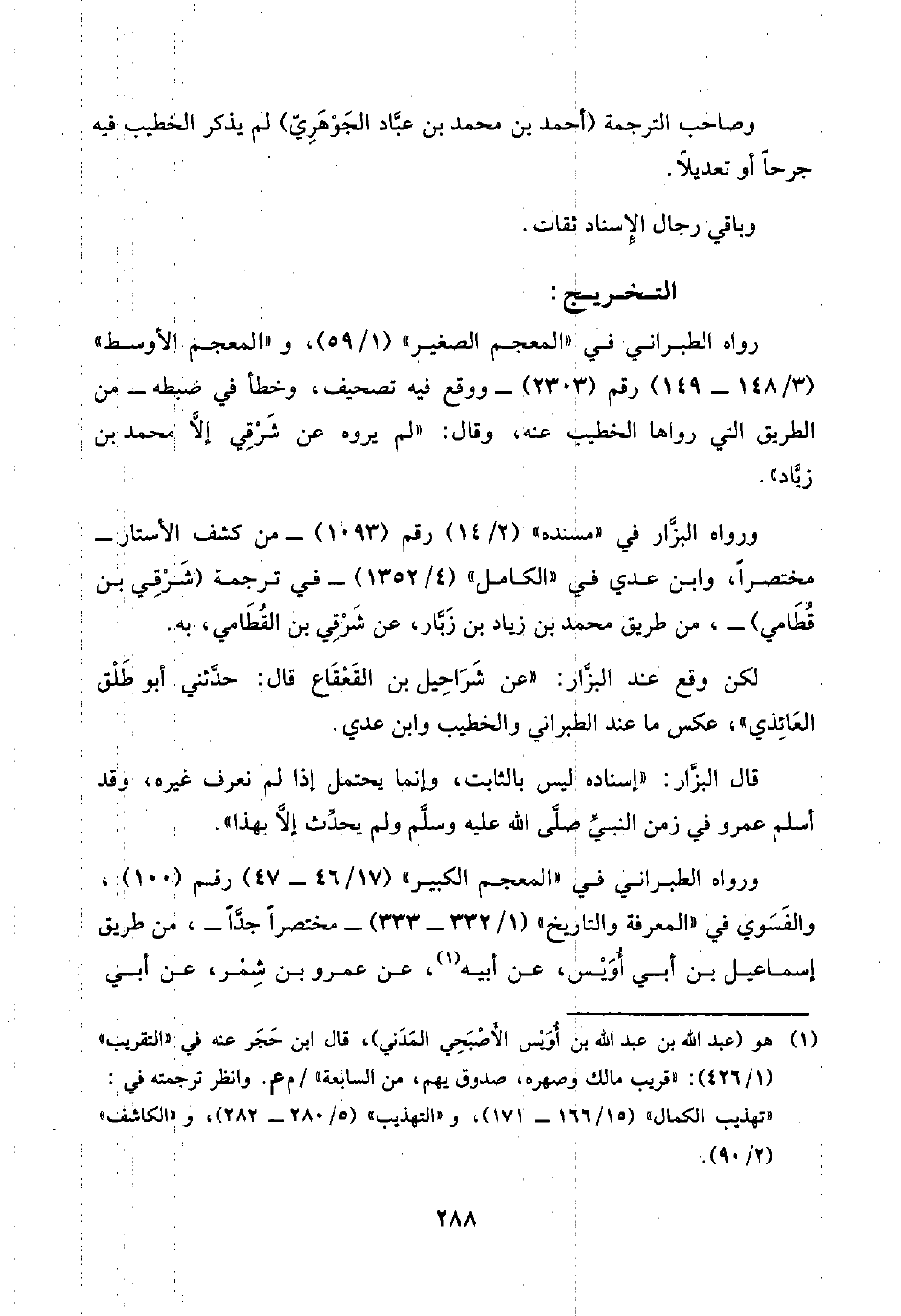 قال البزَّار: "إسناده ليس بالثابت، وإنما يحتمل إذا لم نعرف غيره، وقد أسلم عمرو في زمن النبيِّ صلَّى اللَّه عليه وسلَّم ولم يحدِّث إلَّا بهذا".
