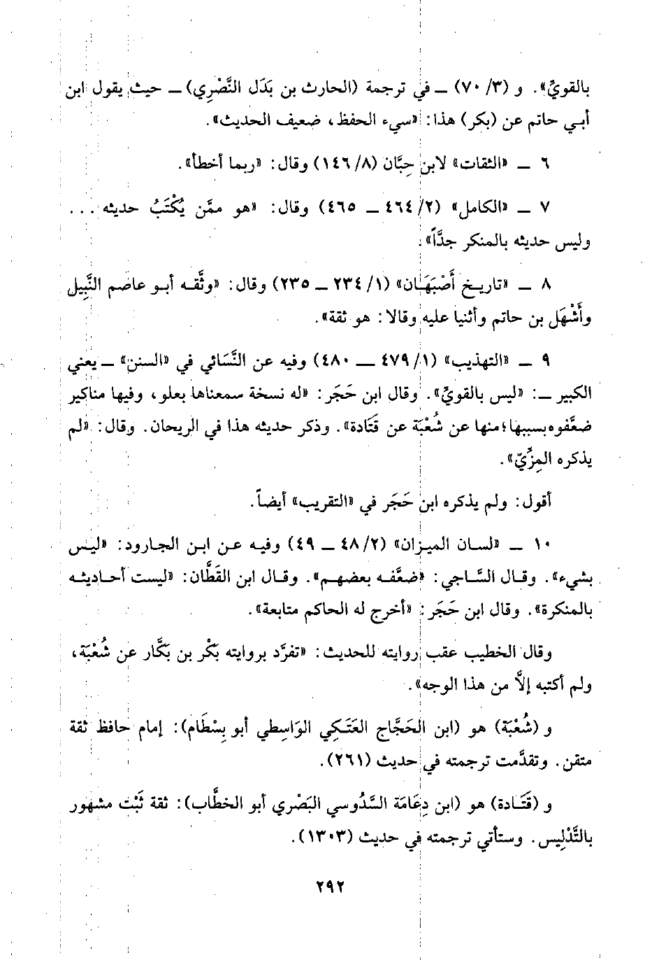 ٩ - "التهذيب" (١/ ٤٧٩ - ٤٨٠) وفيه عن النَّسَائي في "السنن" -يعني الكبير-: "ليس بالقويِّ". وقال ابن حَجَر: "له نسخة سمعناها بعلو، وفيها مناكير ضعَّفوه بسببها؛ منها عن شُعْبَة عن قَتَادة". وذكر حديثه هذا في الريحان. وقال: "لم يذكره المِزِّيّ".