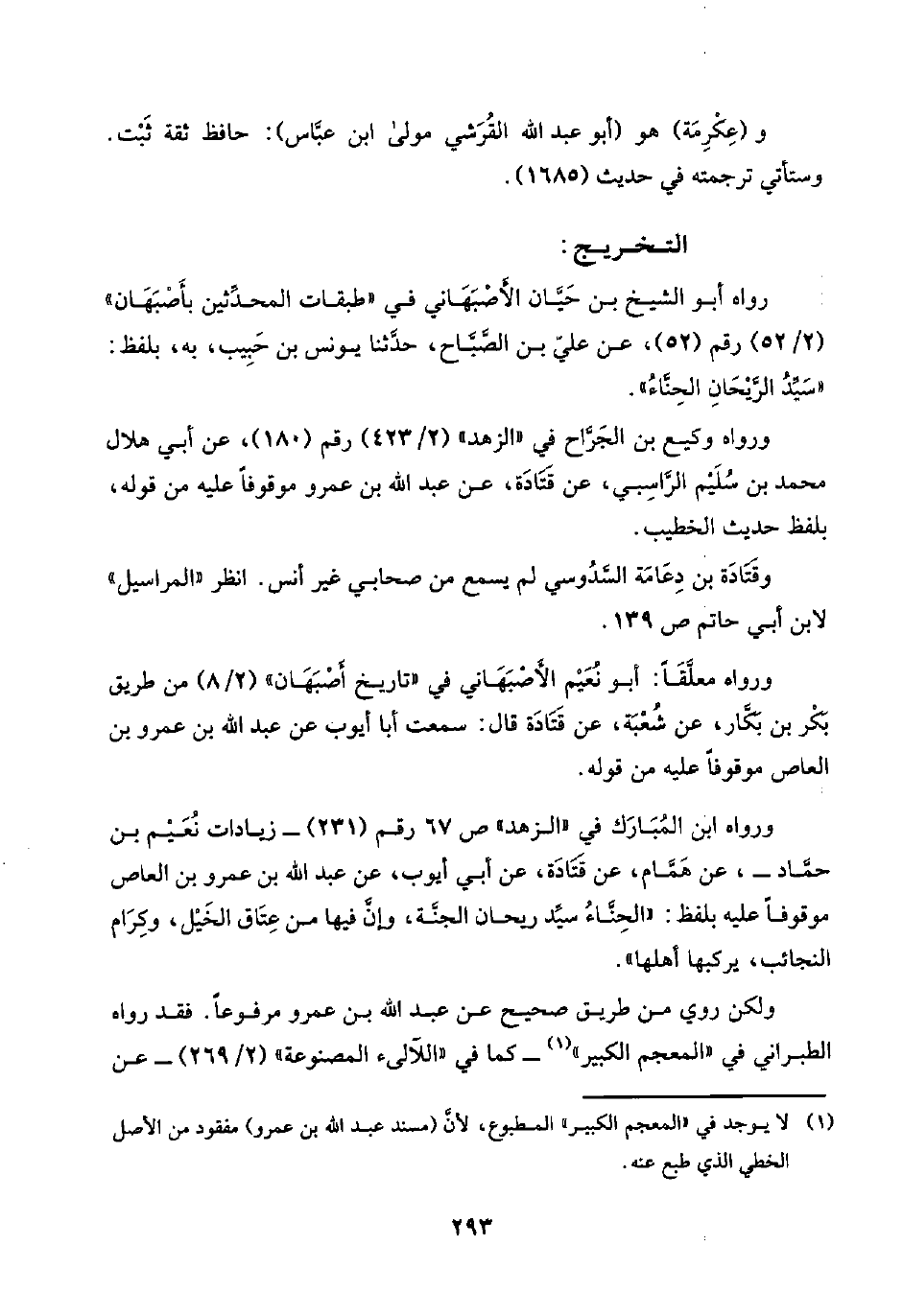 ورواه ابن المُبَارَك في "الزهد" ص ٦٧ رقم (٢٣١) -زيادات نُعَيْم بن حمَّاد-، عن همَّام، عن قَتَادَة، عن أبي أيوب، عن عبد اللَّه بن عمرو بن العاص موقوفًا عليه بلفظ: "الحِنَّاءُ سيِّد ريحان الجَنَّة، وإنَّ فيها من عِتَاق الخَيْل، وكِرَام النجائب، يركبها أهلها".