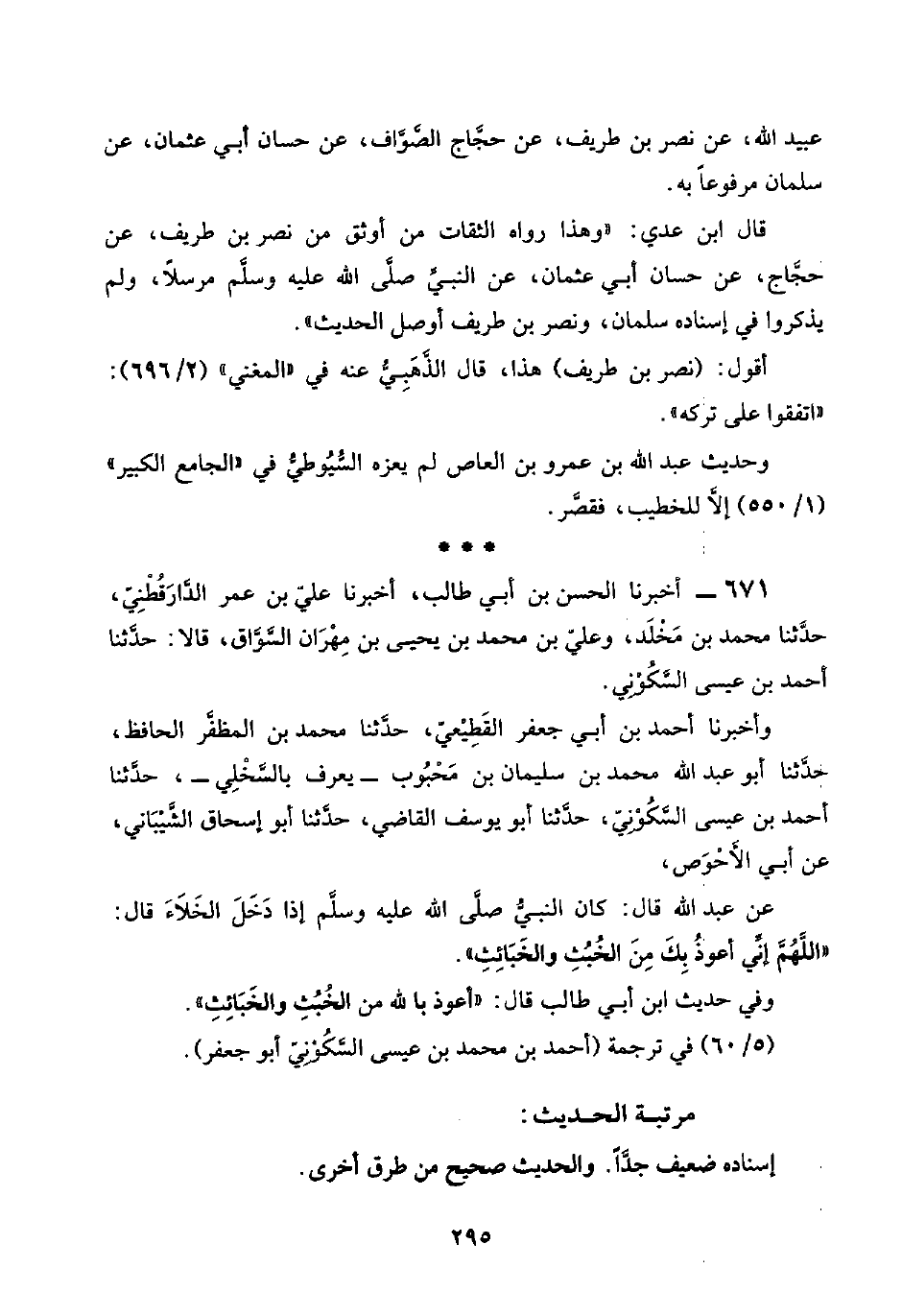 قال ابن عدي: "وهذا رواه الثقات من أوثق من نصر بن طريف، عن حجَّاج، عن حسان أبي عثمان، عن النبيِّ صلَّى اللَّه عليه وسلَّم مرسلًا، ولم يذكروا في إسناده سلمان، ونصر بن طريف أوصل الحديث".