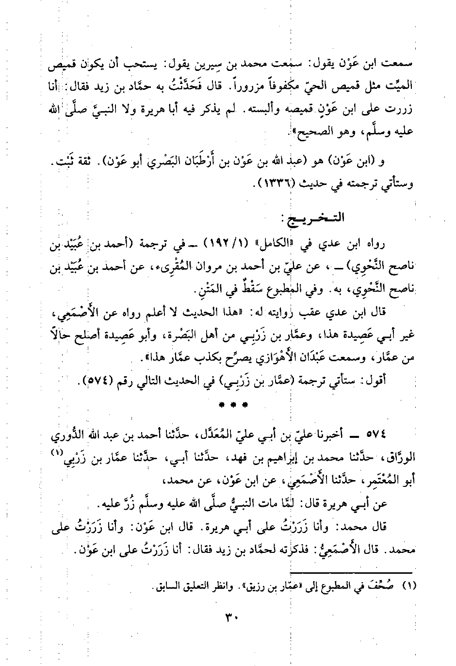 سمعت ابن عَوْن يقول: سمعت محمد بن سِيرين يقول: يستحب أن يكون قميص الميِّت مثل قميص الحيّ مكفوفًا مزرورًا. قال فَحَدَّثْتُ به حمَّاد بن زيد فقال: أنا زررت على ابن عَوْنٍ قميصه وألبسته. لم يذكر فيه أبا هريرة ولا النبيَّ صلَّى اللَّه عليه وسلَّم، وهو الصحيح".