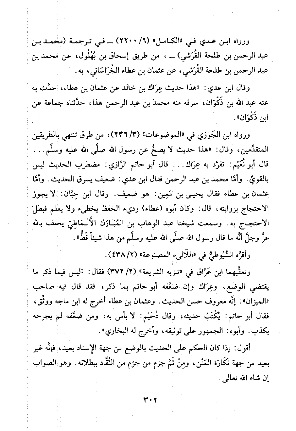 وتعقَّبهما ابن عَرَّاق في "تنزيه الشريعة" (٢/ ٣٧٢) فقال: ليس فيما ذكر ما يقتضي الوضع، وعِرَاك وإن ضعَّفه أبو حاتم بما ذكر، فقد قال فيه صاحب "الميزان": إنَّه معروف حسن الحديث. وعثمان بن عطاء أخرج له ابن ماجه ووثِّق، فقال أبو حاتم: يُكْتَبُ حديثه، وقال دُحَيْم: لا بأس به، ومن ضعَّفه لم يجرحه بكذب. وأبوه: الجمهور على توثيقه، وأخرج له البخاري".