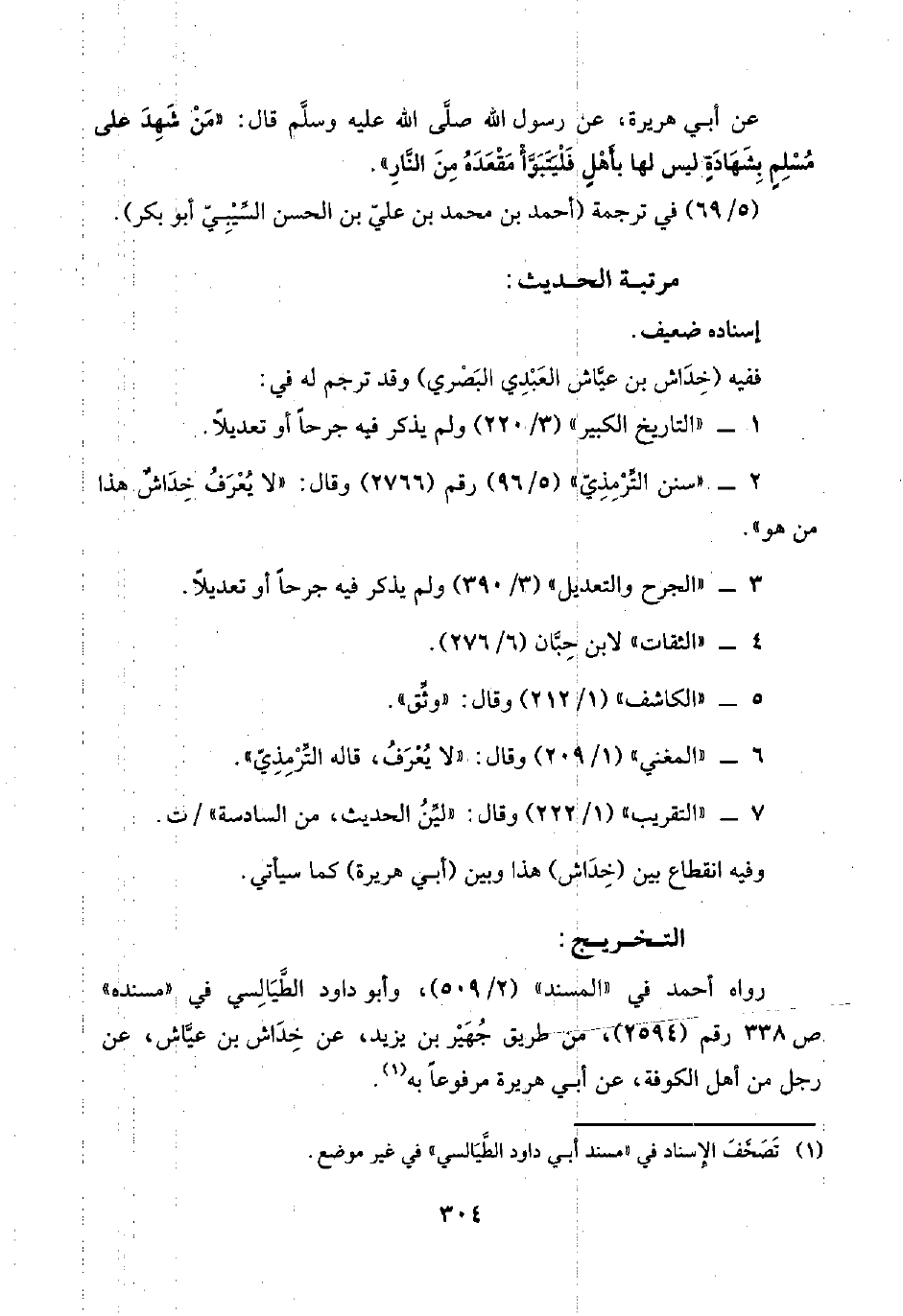 رواه أحمد في "المسند" (٢/ ٥٠٩)، وأبو داود الطَّيَالِسي في "مسنده" ص ٣٣٨ رقم (٢٥٩٤)، من طريق جُهَيْر بن يزيد، عن خِدَاش بن عيَّاش، عن رجل من أهل الكوفة، عن أبي هريرة مرفوعًا به (¬١).