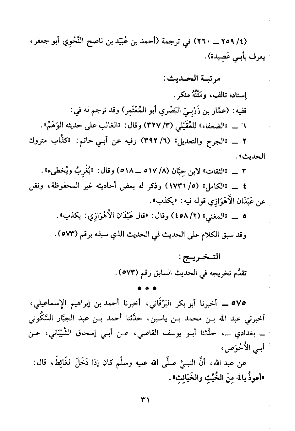 عن عبد اللَّه، أنَّ النبيَّ صلَّى اللَّه عليه وسلَّم كان إذا دَخَلَ الغَائِطَ، قال: "أعوذُ باللَّه من الخُبُثِ والخَبَائِثِ".