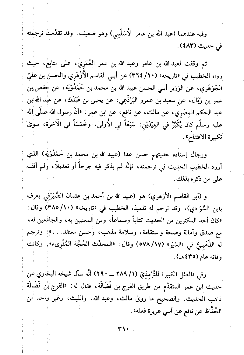 ثم وقفت لعبد اللَّه بن عامر وعبد اللَّه بن عمر العُمَرِي، على متابع، حيث رواه الخطيب في "تاريخه" (١٠/ ٣٦٤) عن أبي القاسم الأَزْهَرِيُّ والحسن بن عليّ الجَوْهَرِي، عن الوزير أبي الحسن عبيد اللَّه بن محمد بن حَمْدُوْيَه، عن حفص بن عمر بن رَبَال، عن سعيد بن عمرو البَرْذَعِي، عن يحيى بن عَبْدَك، عن عبد اللَّه بن عبد الحكم المِصْرِي، عن مالك، عن نافع، عن ابن عمر: "أنَّ رسول اللَّه صلَّى اللَّه عليه وسلَّم كان يُكَبِّرُ في العِيْدَيْنِ: سَبْعًا في الأُولى، وخَمْسًا في الآخرة، سوى تكبيرة الافتتاح".