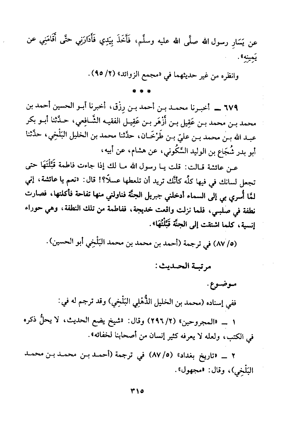 ٢ - "تاريخ بغداد" (٥/ ٨٧) في ترجمة (أحمد بن محمد بن محمد البَلْخِي)، وقال: "مجهول".
