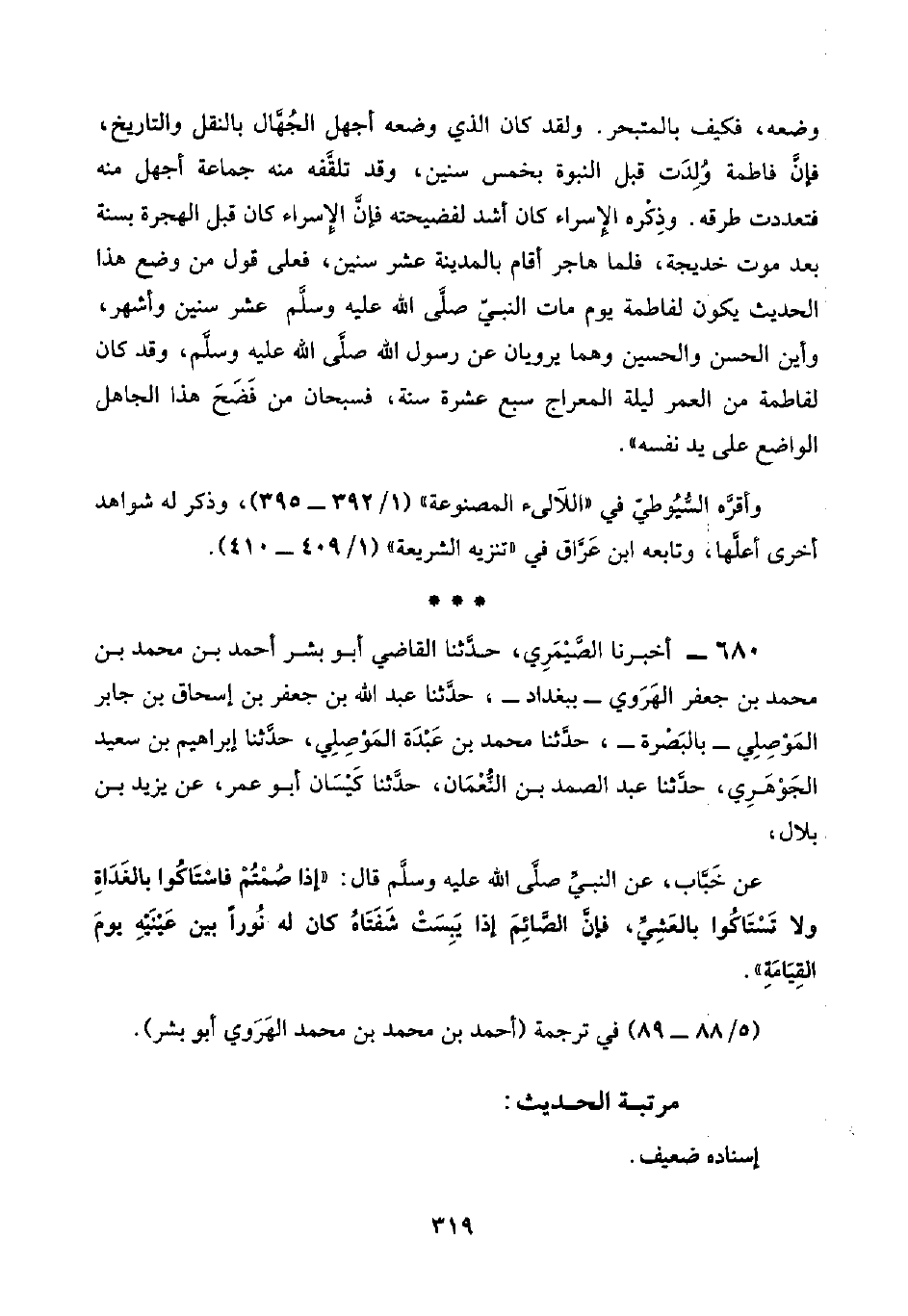 وضعه، فكيف بالمتبحر. ولقد كان الذي وضعه أجهل الجُهَّال بالنقل والتاريخ، فإنَّ فاطمة وُلِدَت قبل النبوة بخمس سنين، وقد تلقَّفه منه جماعة أجهل منه فتعددت طرقه. وذِكْره الإسراء كان أشد لفضيحته فإنَّ الإسراء كان قبل الهجرة بسنة بعد موت خديجة، فلما هاجر أقام بالمدينة عشر سنين، فعلى قول من وضع هذا الحديث يكون لفاطمة يوم مات النبيّ صلَّى اللَّه عليه وسلَّم عشر سنين وأشهر، وأين الحسن والحسين وهما يرويان عن رسول اللَّه صلَّى اللَّه عليه وسلَّم، وقد كان الفاطمة من العمر ليلة المعراج سبع عشرة سنة، فسبحان من فَضَحَ هذا الجاهل الواضع على يد نفسه".