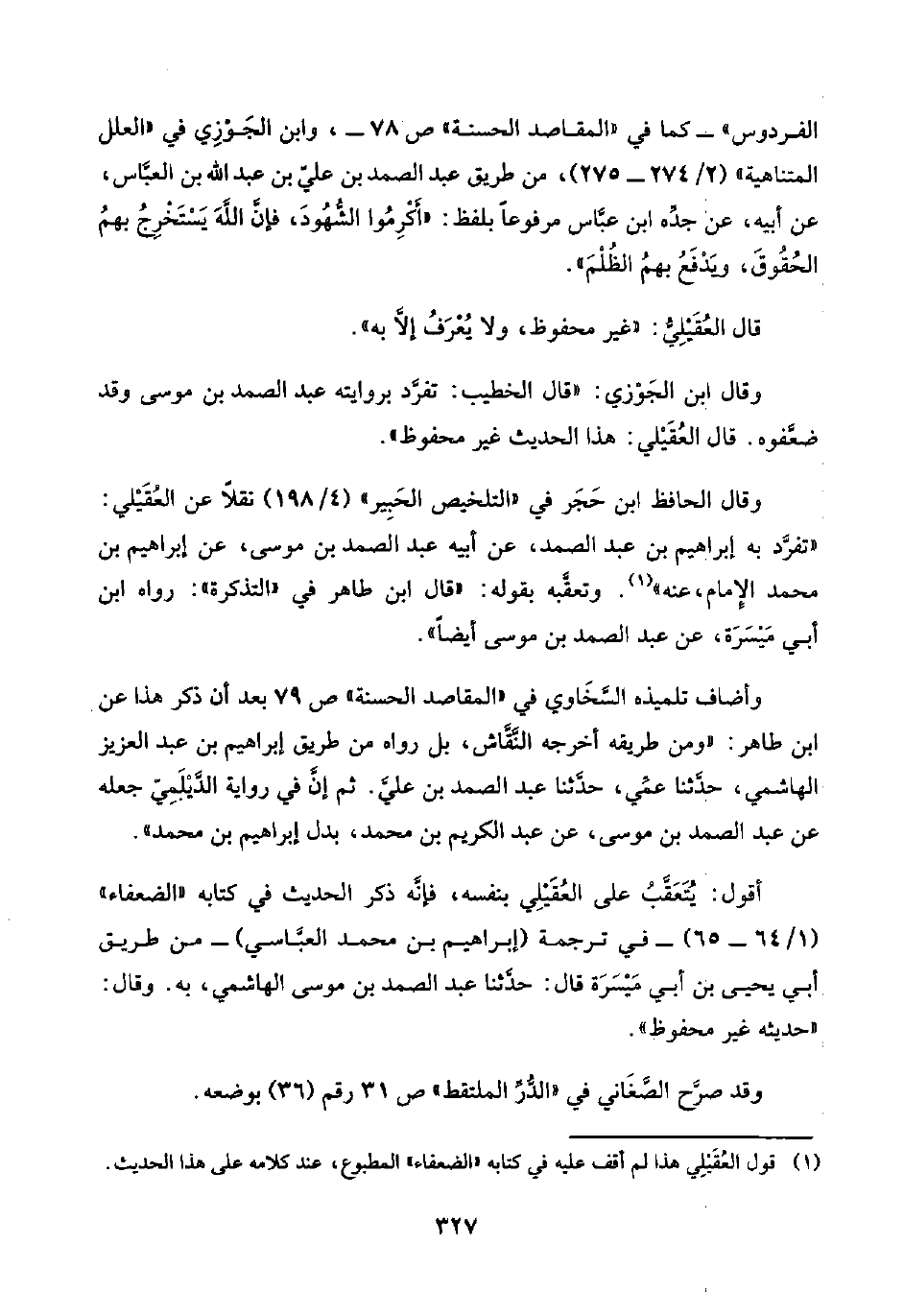 وأضاف تلميذه السَّخَاوي في "المقاصد الحسنة" ص ٧٩ بعد أن ذكر هذا عن ابن طاهر: "ومن طريقه أخرجه النَّقَّاش، بل رواه من طريق إبراهيم بن عبد العزيز الهاشمي، حدَّثنا عمِّي، حدَّثنا عبد الصمد بن عليَّ. ثم إنَّ في رواية الدَّيْلَمِيّ جعله عن عبد الصمد بن موسى، عن عبد الكريم بن محمد، بدل إبراهيم بن محمد".