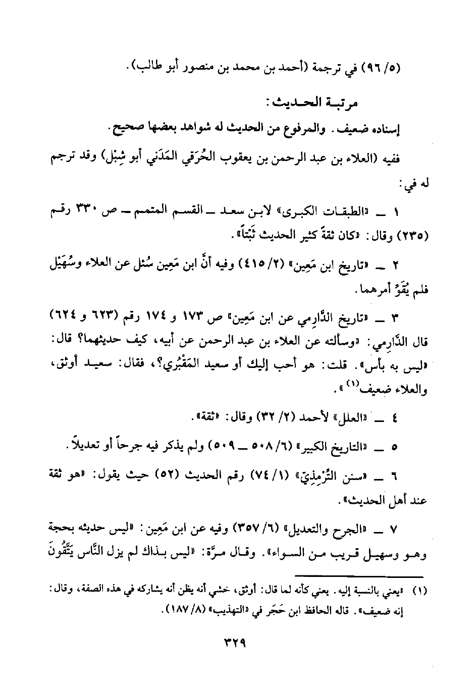 ٣ - "تاريخ الدَّارِمي عن ابن مَعِين" ص ١٧٣ و ١٧٤ رقم (٦٢٣ و ٦٢٤) قال الدَّارِمي: "وسألته عن العلاء بن عبد الرحمن عن أبيه، كيف حديثهما؟ قال: "ليس به بأس". قلت: هو أحب إليك أو سعيد المَقْبُري؟ ، فقال: سعيد أوثق، والعلاء ضعيف (¬١) ".