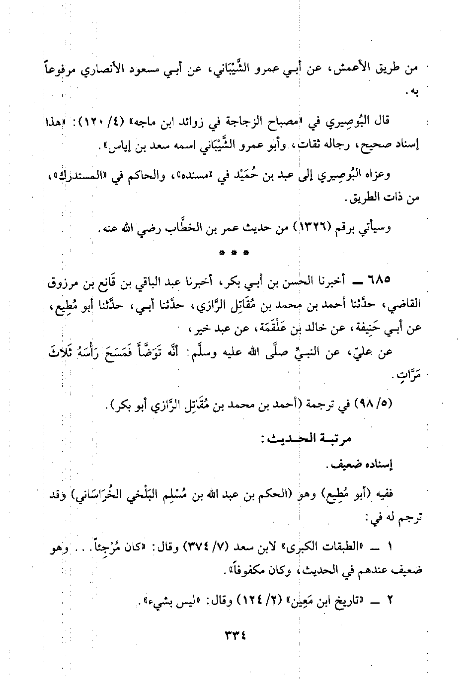 ٦٨٥ - أخبرنا الحسن بن أبي بكر، أخبرنا عبد الباقي بن قَانع بن مرزوق القاضي، حدَّثنا أحمد بن محمد بن مُقَاتِل الرَّازي، حدَّثنا أبي، حدَّثنا أبو مُطِيع، عن أبي حَنِيفة، عن خالد بن عَلْقَمَة، عن عبد خير،