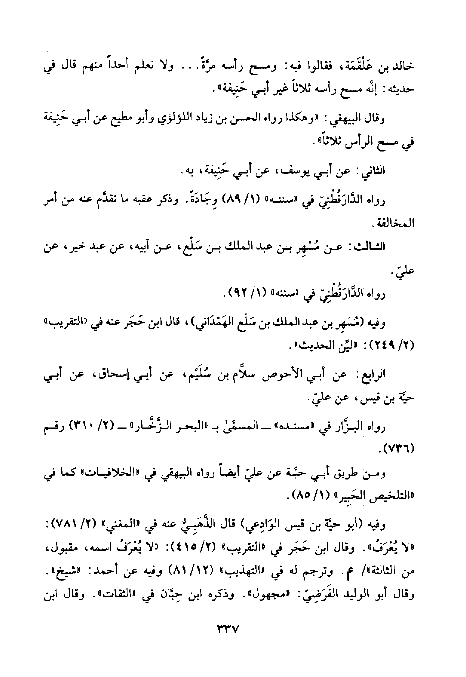 خالد بن عَلْقَمَة، فقالوا فيه: ومسح رأسه مرَّةً. . . ولا نعلم أحدًا منهم قال في حديثه: إنَّه مسح رأسه ثلاثًا غير أبي حَنِيفة".