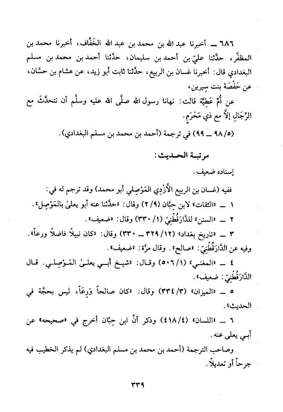 ٦٨٦ - أخبرنا عبد اللَّه بن محمد بن عبد اللَّه الخَفَّاف، أخبرنا محمد بن المظفَّر, حدَّثنا عليّ بن أحمد بن سليمان، حدَّثنا أحمد بن محمد بن مسلم البغدادي قال: أخبرنا غسان بن الربيع، حدَّثنا ثابت أبو زيد، عن هشام بن حسَّان، عن حَفْصَة بنت سِيرين,