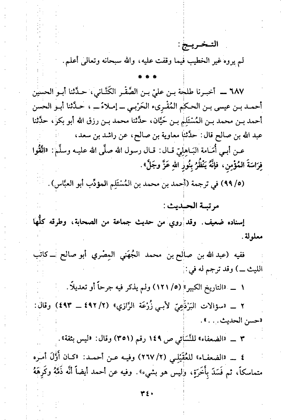 ٦٨٧ - أخبرنا طلحة بن عليّ بن الصَّقْر الكَتَّاني، حدَّثنا أبو الحسين أحمد بن عيسى بن الحكم المُقْرئ الحَرْبي -إملاءً-، حدَّثنا أبو الحسن أحمد بن محمد بن المُسْتَلِم بن حَيَّان، حدَّثنا محمد بن رزق اللَّه أبو بكر، حدَّثنا عبد اللَّه بن صالح قال: حدَّثنا معاوية بن صالح، عن راشد بن سعد،
